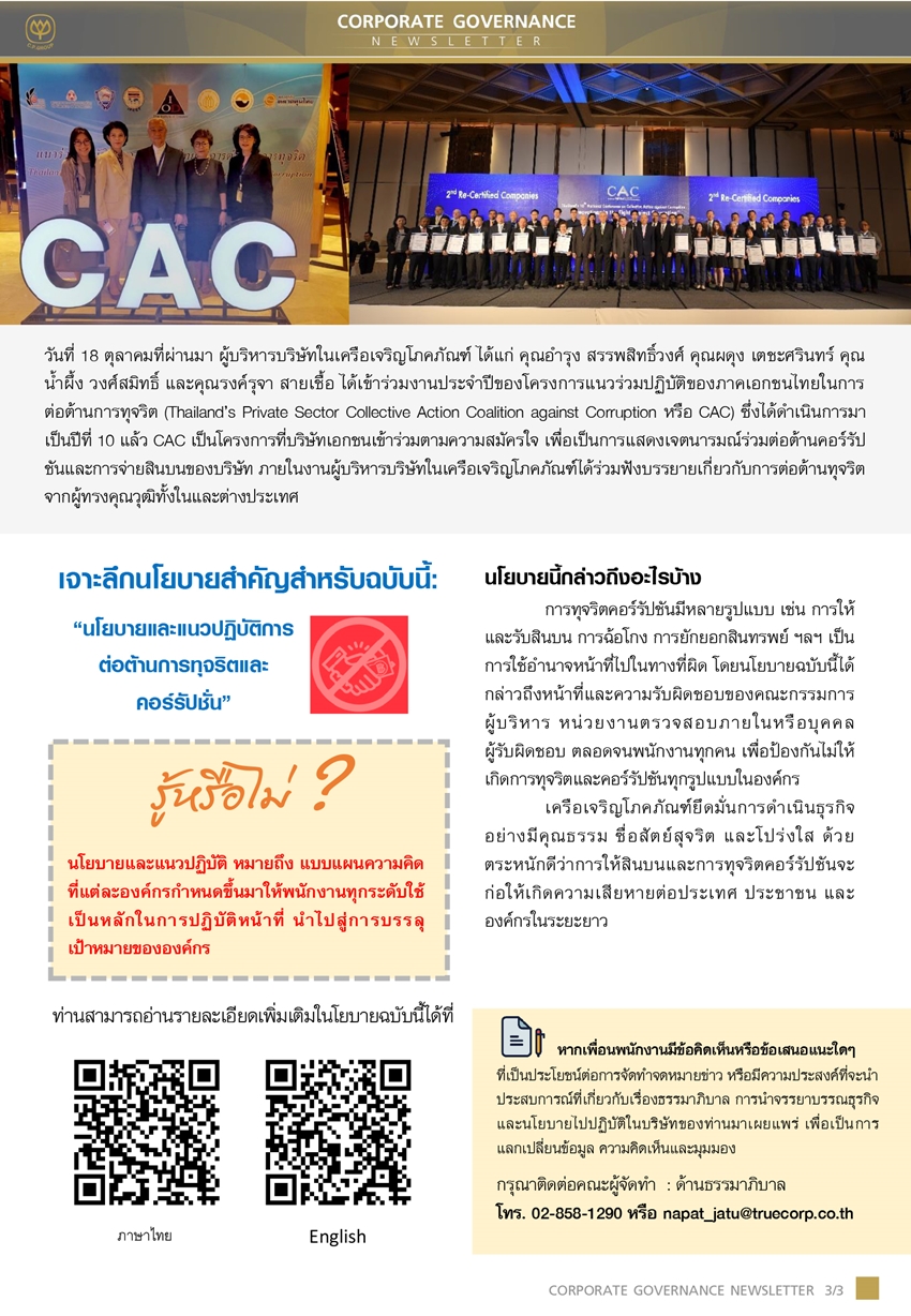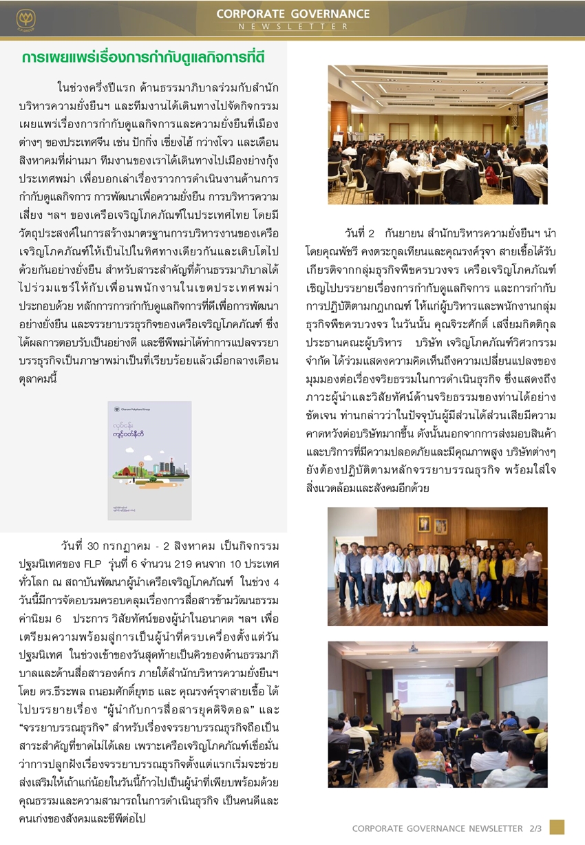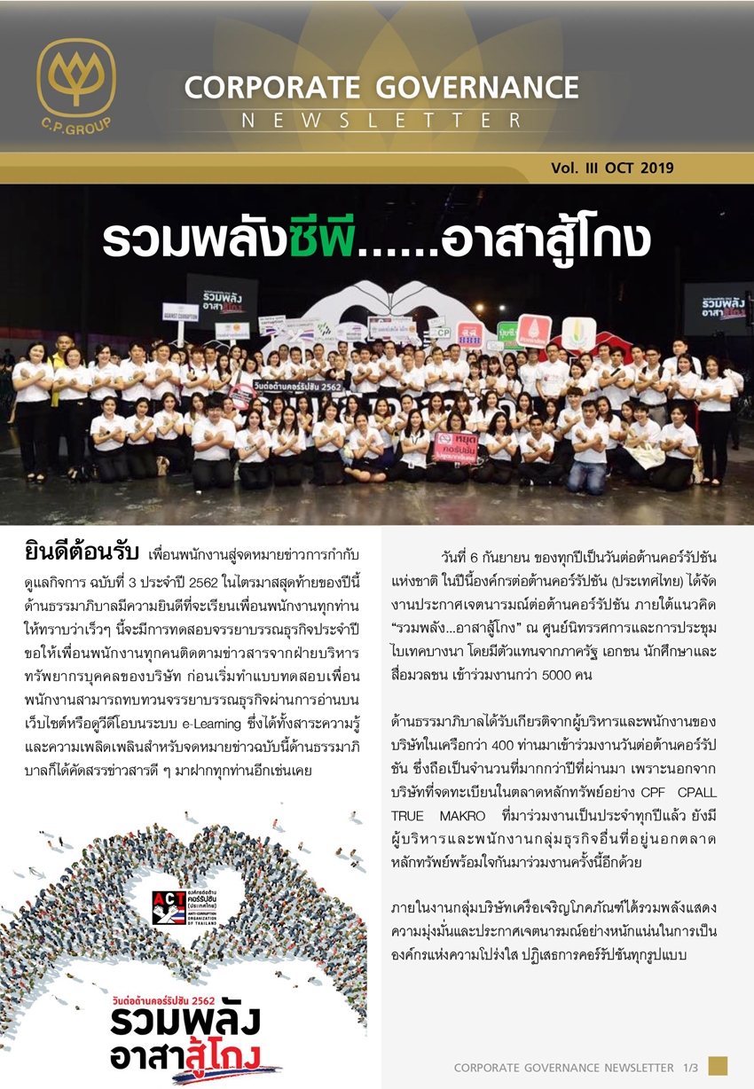 ทีมงานด้านธรรมาภิบาล เครือเจริญโภคภัณฑ์ได้จัดทำจดหมายข่าวการกำกับดูแลกิจการ ฉบับ ที่ 3/2562 มีความเคลื่อนไหวข่าวสารด้านการกำกับดูแลกิจการ รวมถึงพัฒนาการเรื่องการกำกับดูแลกิจการของบริษัทในเครือเจริญโภคภัณฑ์ นำมาแบ่งปันให้ชาวซีพีทราบกัน