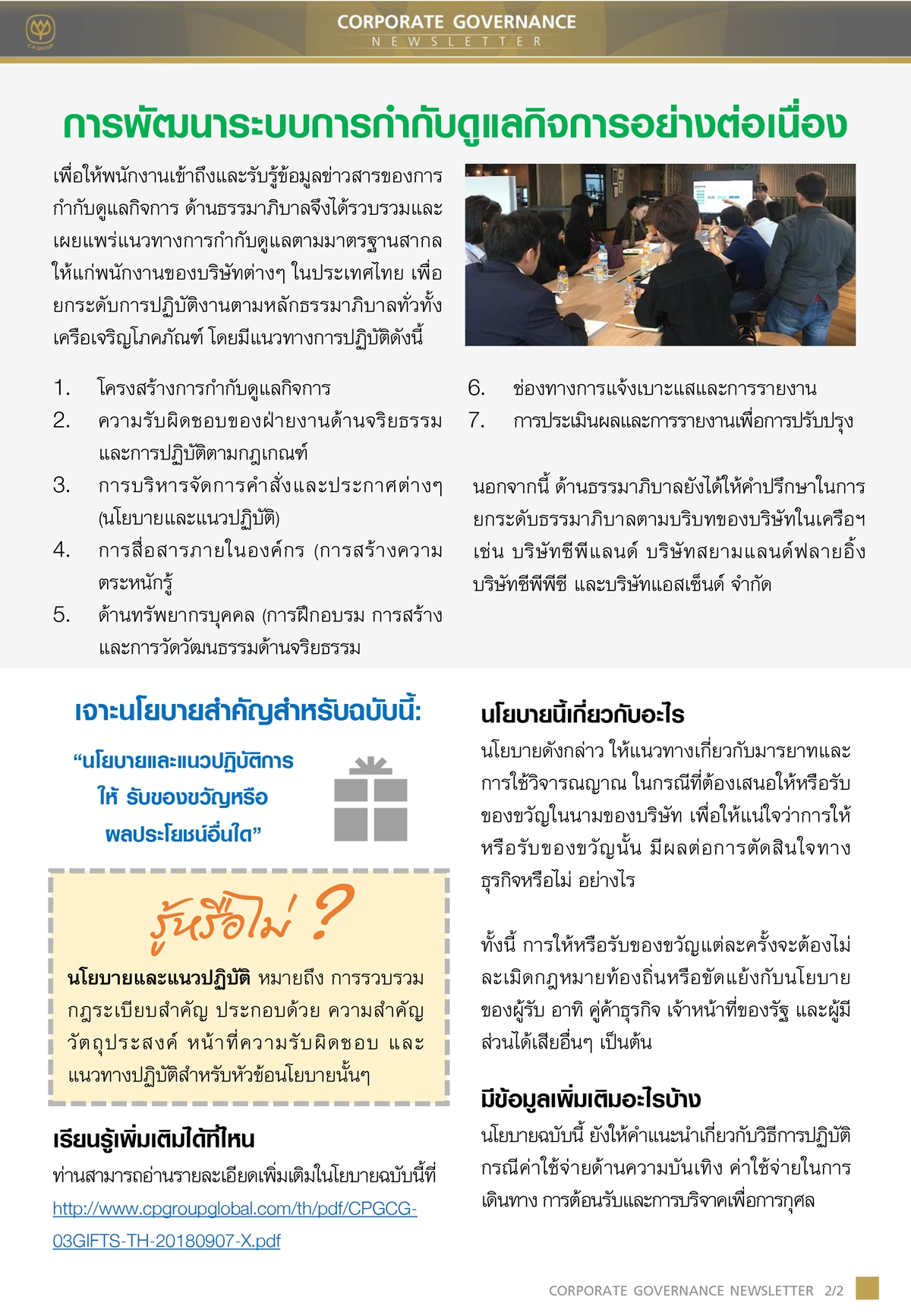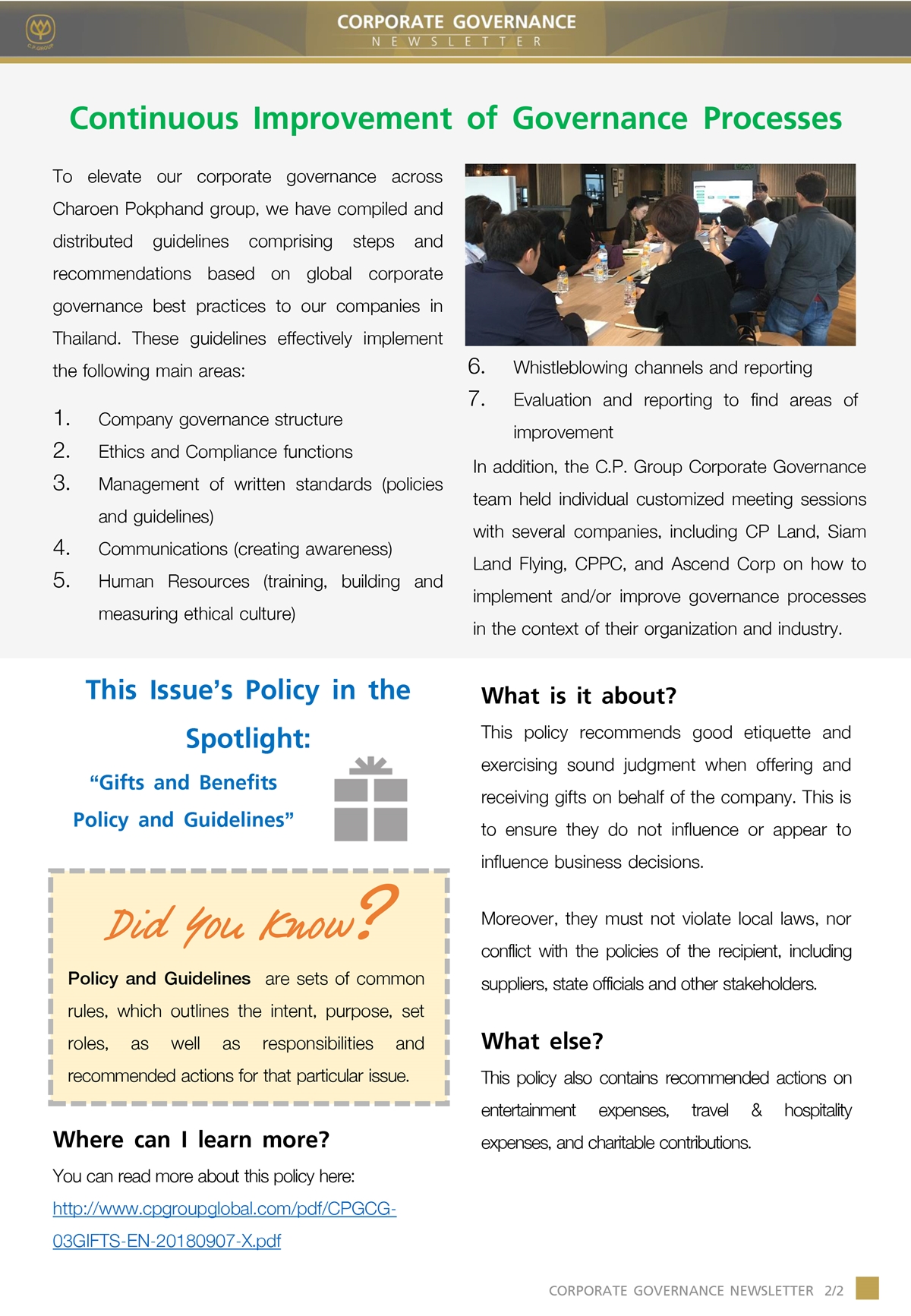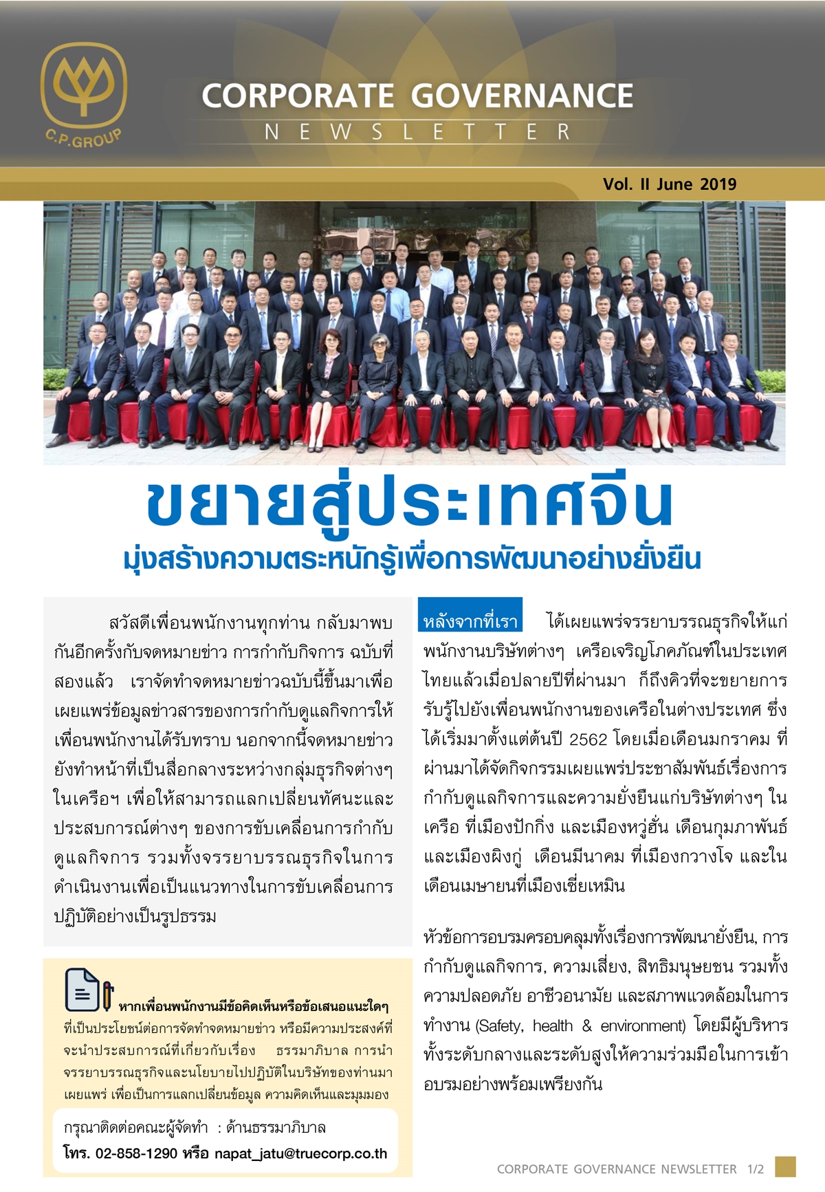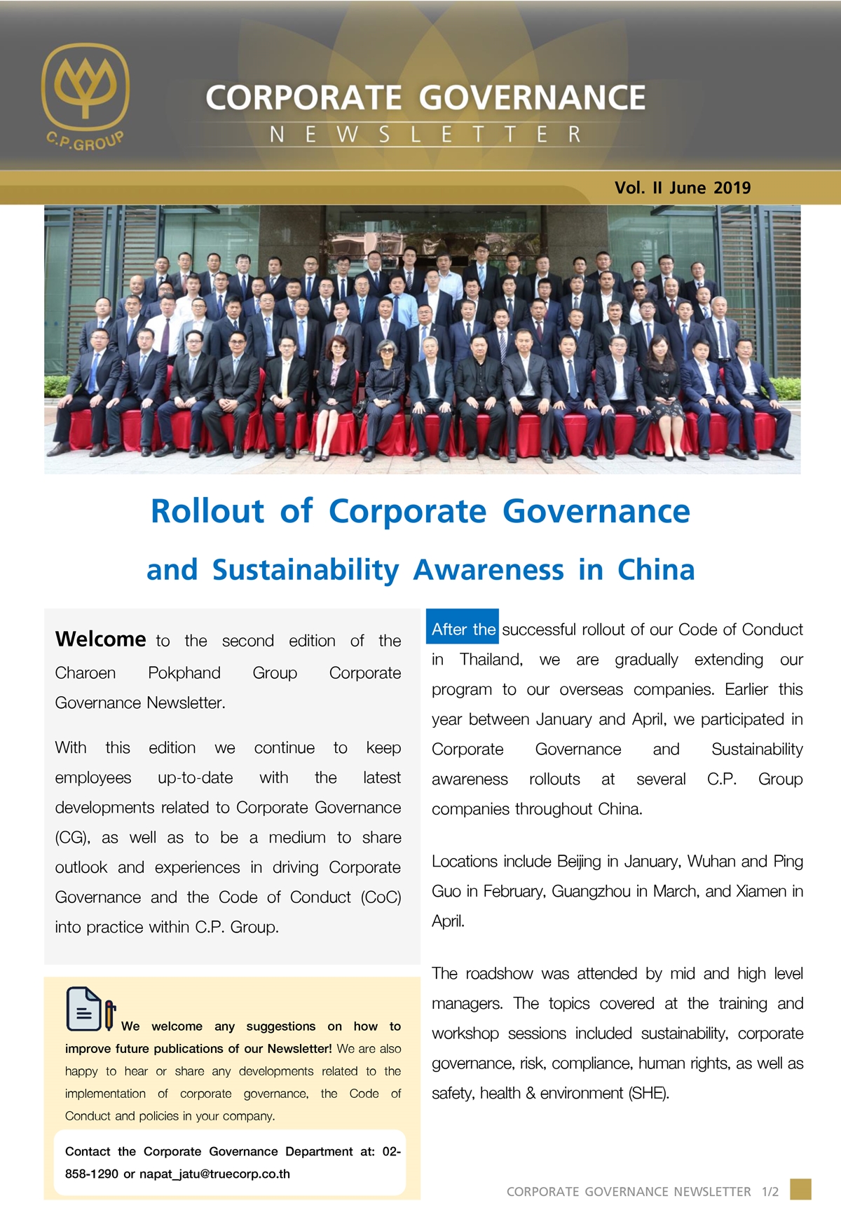 ด้านธรรมาภิบาล สำนักบริหารความยั่งยืน ธรรมาภิบาลและสื่อสารองค์กร เครือเจริญโภคภัณฑ์เผยแพร่จดหมายข่าวCG-Newsletter ฉบับ ที่ 2 เพื่อเป็นสื่อกลางในการสื่อสารเผยแพร่ข่าวสารด้านการกำกับดูแลกิจการ รวมถึงพัฒนาการเรื่องการกำกับดูแลกิจการของบริษัทในเครือเจริญโภคภัณฑ์ โดยมีเนื้อที่น่าสนใจ เกี่ยวกับการเผยแพร่การเรียนรู้และฝึกอบรมจรรยาบรรณธุรกิจไปยังเพื่อนพนักงานในประเทศจีน พัฒนาระบบเพื่อยกระดับการปฏิบัติงานตามการกำกับดูแลกิจการ