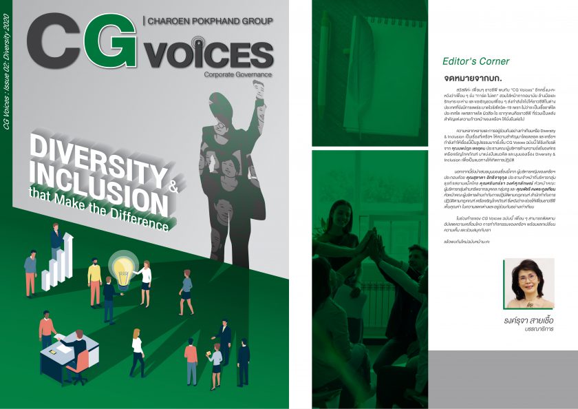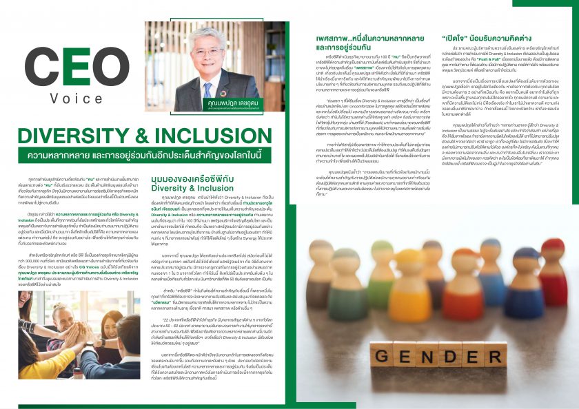 ในคอลัมน์ CEO Voice ฉบับนี้ได้รับเกียรติจากคุณนพปฏล เดชอุดม ประธานคณะผู้บริหารด้านความยั่งยืนองค์กร เครือฯ มาแบ่งปันแนวคิดและมุมมองเรื่อง Diversity & Inclusion เพื่อเป็นแนวทางให้เกิดการปฏิบัติ พร้อมเสริมทัพมุมมองความหลากหลายกับ ดร.เนติธร ประดิษฐ์สาร สำนักความร่วมมือระหว่างประเทศ ด้านความยั่งยืนและสื่อสารองค์กร และคุณปรีชา ธนสุกาญจน์ สำนักทรัพยากรบุคคล เครือฯ