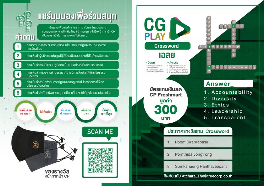 ร่วมแชร์มุมมองด้านจรรยาบรรณธุรกิจ ลุ้นรับหน้ากากผ้า CP จำนวน 50 รางวัล ได้ที่นี่ หรือสแกน QR Code จากในเล่มได้เลย