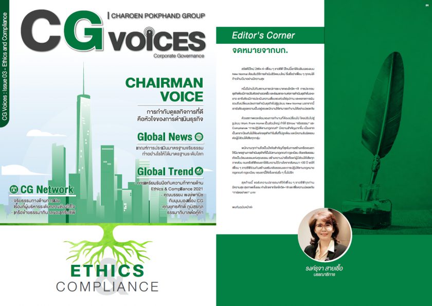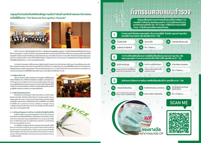 พลาดไม่ได้กับคอลัมน์อัพเดทธรรมาภิบาลขององค์กรธุรกิจทั่วโลกและข่าวความเคลื่อนไหวด้านธรรมาภิบาลของเครือฯ นอกจากนี้ท้ายเล่มยังมีกิจกรรมร่วมตอบคำถาม ลุ้นรับหน้ากากอนามัย CP จำนวน 10 ชิ้นต่อท่าน ได้ที่นี่ หรือสแกน QR Code จากในเล่มได้เลย
