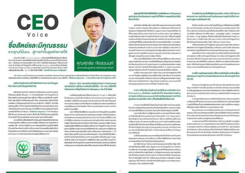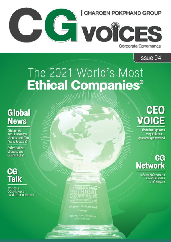 The 2021 world’s most ethical companies เครือซีพีได้รับเป็น 1 ใน 135 บริษัทที่มีจริยธรรมมากที่สุดในโลก ประจำปี 2564 จาก Ethisphere Institute สถาบันชั้นนำระดับโลกที่กำหนดและประมวลมาตรฐานการดำเนินธุรกิจที่มีจริยธรรม ซึ่งบริษัทที่ได้รับคัดเลือกให้ได้รับรางวัลจำนวน 135 บริษัทนี้ มาจาก 47 กลุ่มอุตสาหกรรม ครอบคลุม 22 ประเทศทั่วโลก เครือซีพีเป็นหนึ่งในบริษัทชั้นนำที่ทัดเทียมระดับโลกได้ด้วยความร่วมมือร่วมใจของเพื่อนๆ พนักงานทุกคน