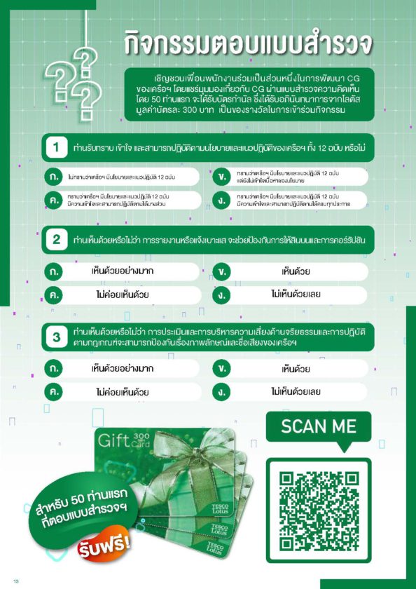 พลาดไม่ได้กับคอลัมน์อัพเดทธรรมาภิบาลขององค์กรธุรกิจทั่วโลกและข่าวความเคลื่อนไหวด้านธรรมาภิบาลของเครือฯ นอกจากนี้ท้ายเล่มยังมีกิจกรรมร่วมตอบคำถาม ลุ้นรับ Lotus’s Gift Card จำนวน 50 ชิ้นต่อท่าน สแกน QR Code จากในเล่มได้เลย