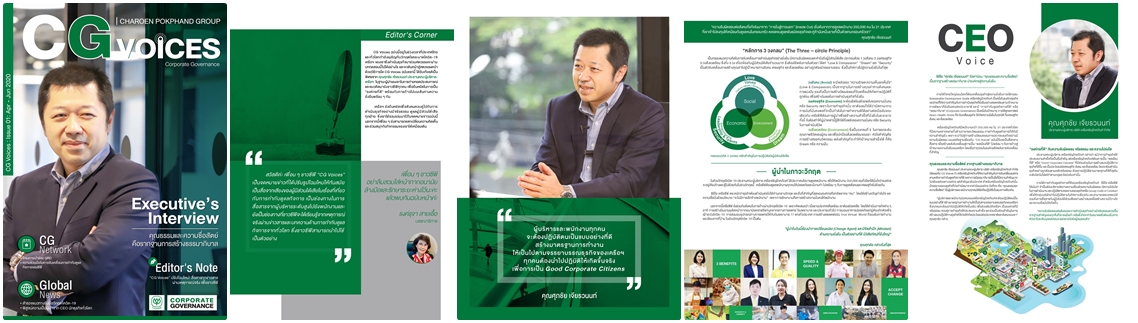 การกำกับดูแลกิจการที่ดี (CG: Corporate Governance) เป็นอีกหนึ่งเรื่องที่เครือเจริญโภคภัณฑ์ให้ความสำคัญ และขับเคลื่อนอย่างต่อเนื่อง นิตยสาร CG Voice จะเป็นสื่อกลางในการสื่อสารจากผู้บริหารระดับสูงสู่พนักงาน และได้เรียนรู้การกำกับดูแลกิจการจากทั่วโลก