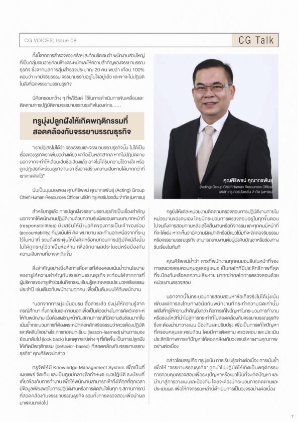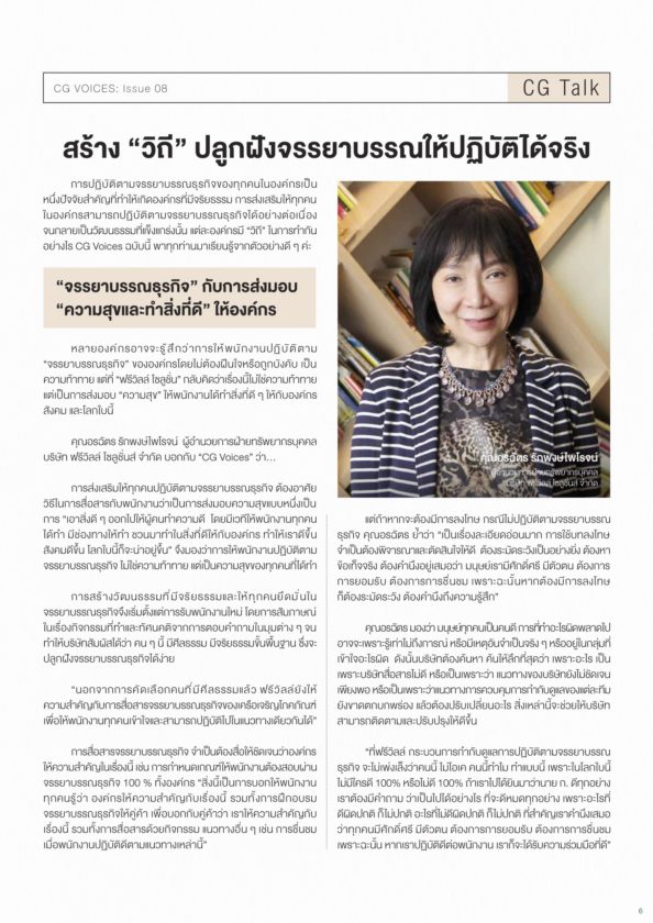 การปฏิบัติตามจรรยาบรรณธุรกิจของทุกคนในองค์กรเป็นหนึ่งปัจจัยสำคัญที่ทำให้เกิดองค์กรที่มีจริยธรรม การส่งเสริมให้ทุกคนในองค์กรสามารถปฏิบัติตามจรรยาบรรณธุรกิจได้อย่างต่อเนื่องจนกลายเป็นวัฒนธรรมที่แข็งแกร่งนั้น แต่ละองค์กรมี “วิถี” ในการทำกันอย่างไร CG Voice ฉบับนี้พาทุกท่านมาเรียนรู้จากตัวอย่างดี ๆ ค่ะ