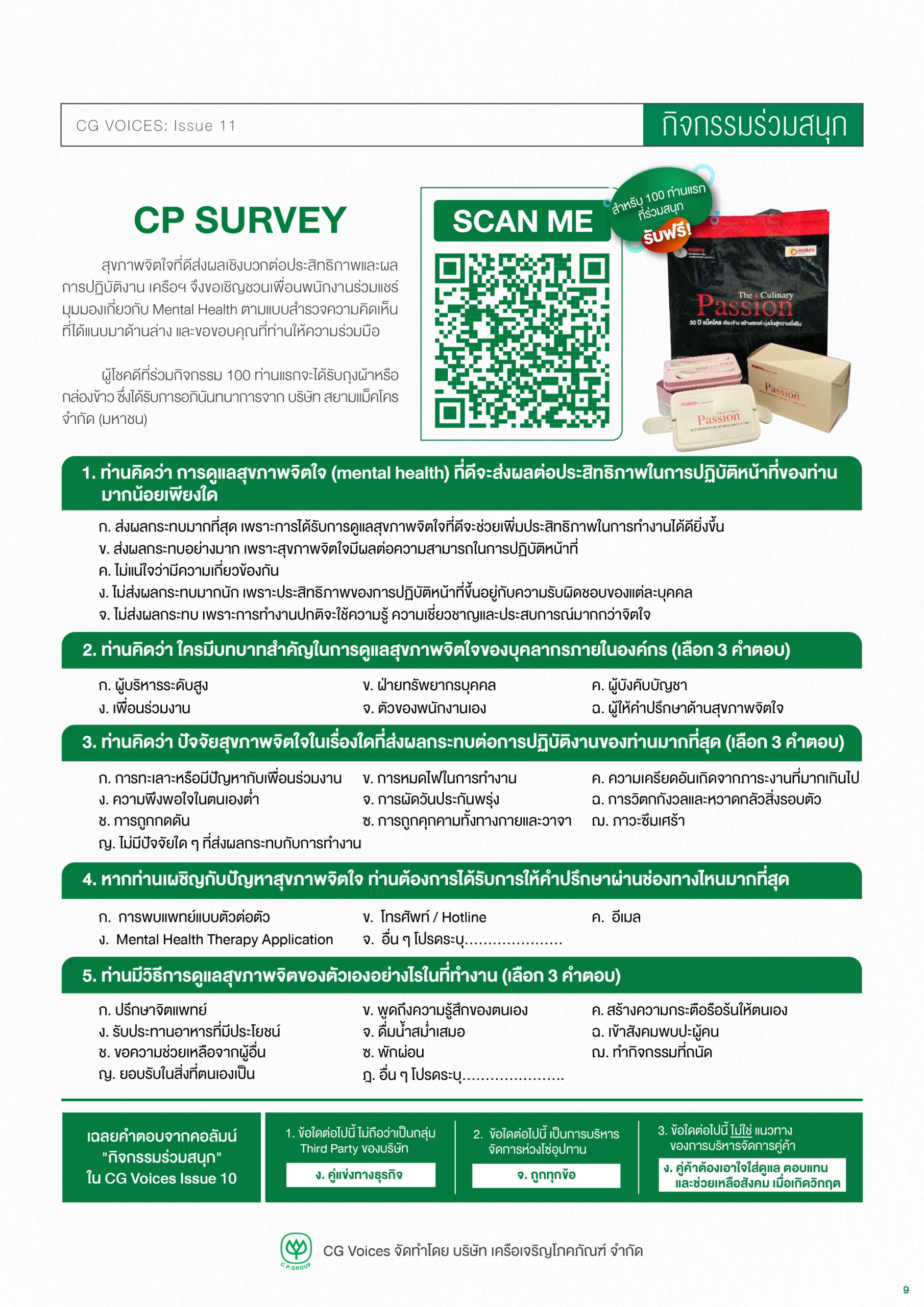 ท้ายเล่มยังมีกิจกรรม ชวนเพื่อนพนักงานร่วมแชร์มุมมองเกี่ยวกับ Mental Health ผ่านแบบสำรวจความคิดเห็น เพื่อเป็นข้อมูลในการพัฒนาแนวทางการดูแลสุขภาพจิตใจของเครือฯ ต่อไป