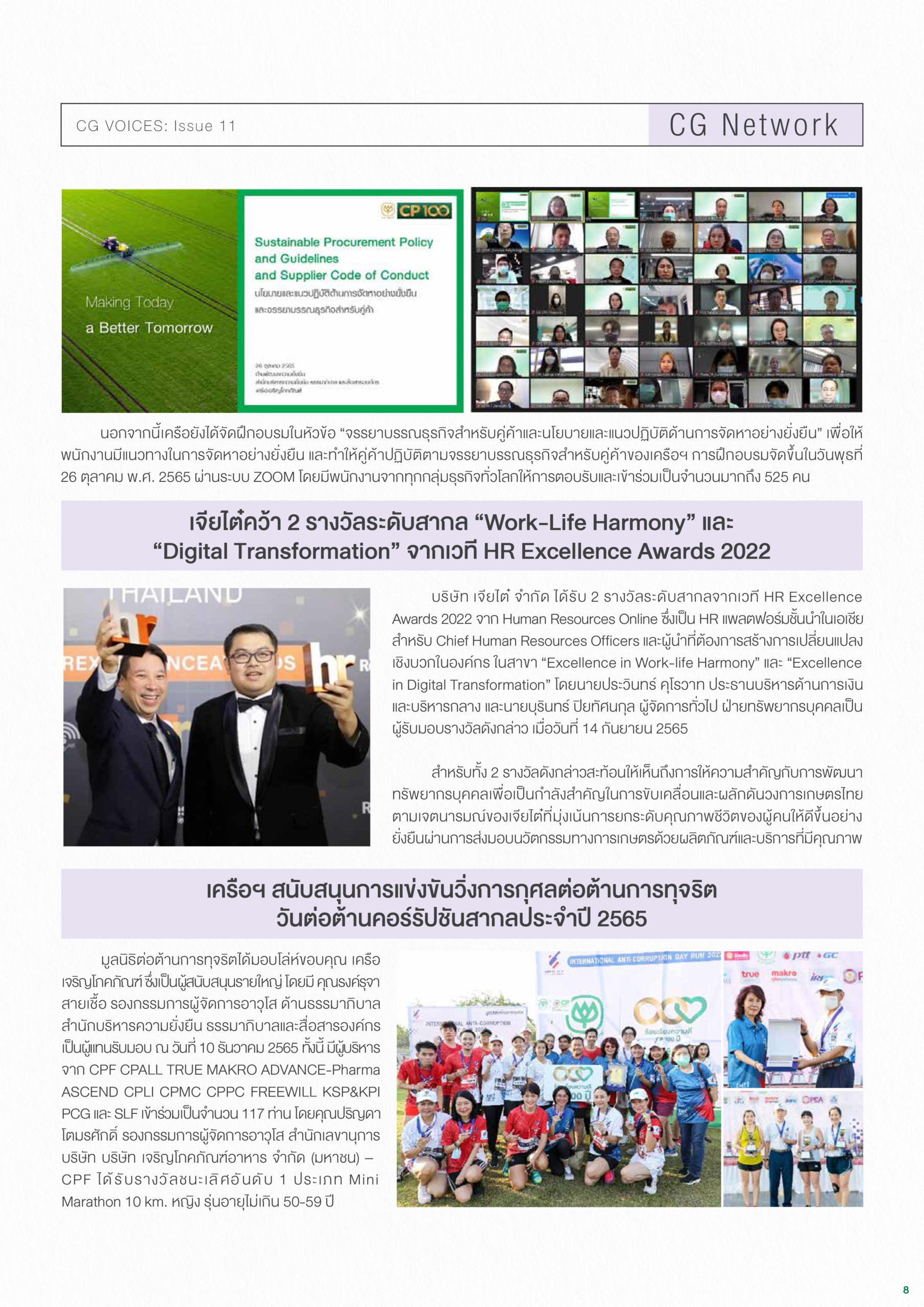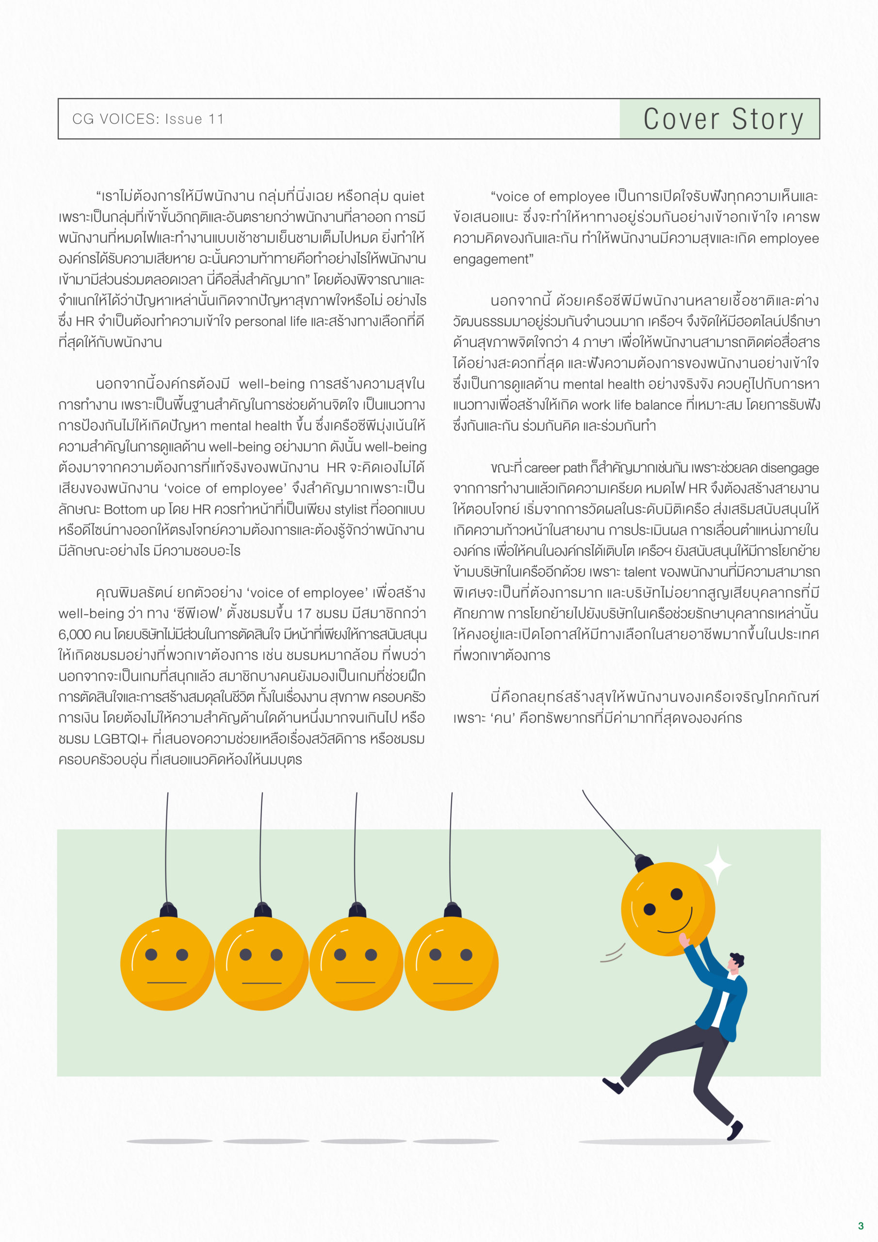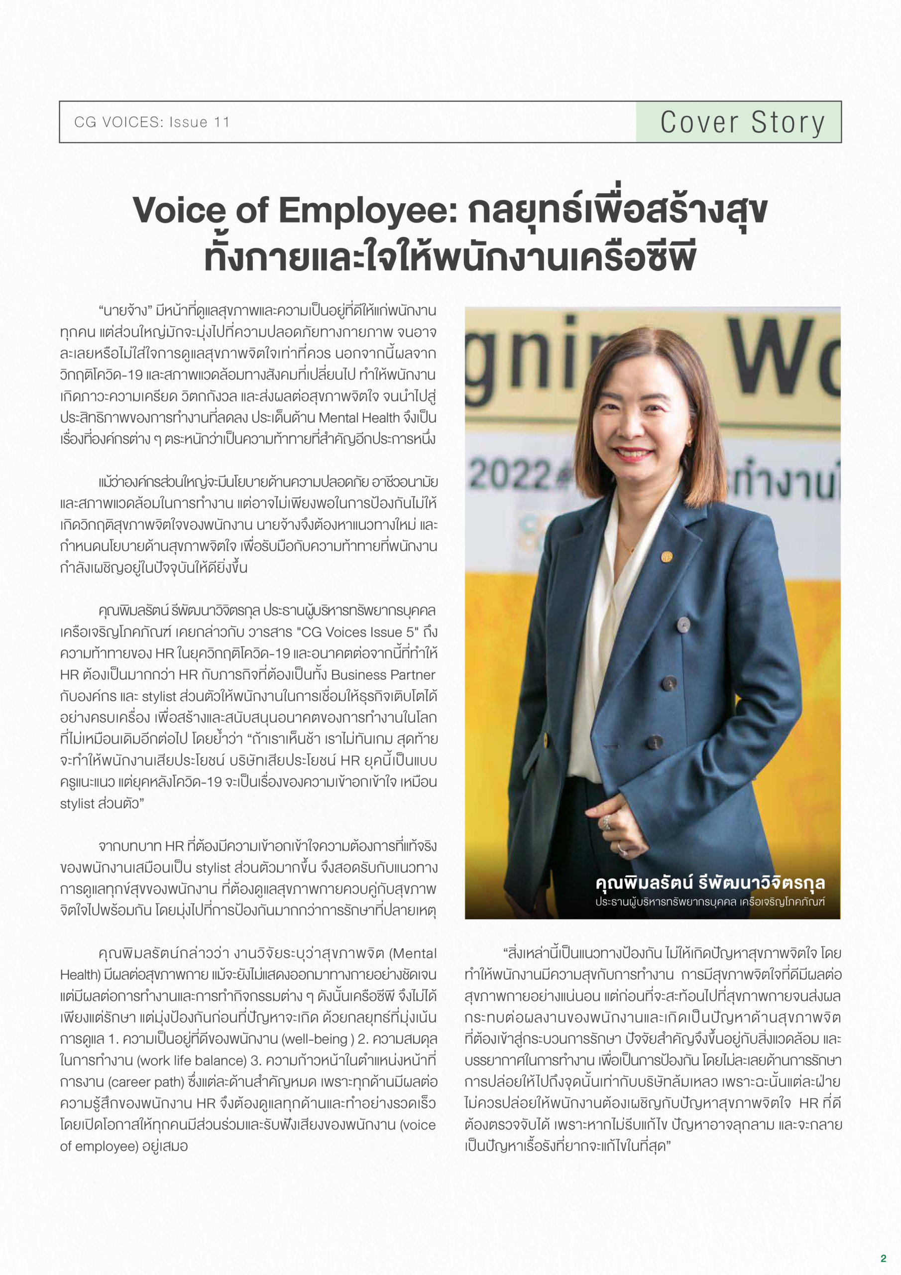 คอลัมน์ Cover Story: ฉบับนี้ คุณพิมลรัตน์ รีพัฒนาวิจิตรกุล ประธานผู้บริหารทรัพยากรบุคคล เครือเจริญโภคภัณฑ์ มาเล่าถึงกลยุทธ์เพื่อสร้างสุขทั้งกายและใจให้พนักงานเครือซีพี และแบ่งปันนโยบายและแนวทางการดูแลสุขภาพกายและจิตใจของเครือ ฯ