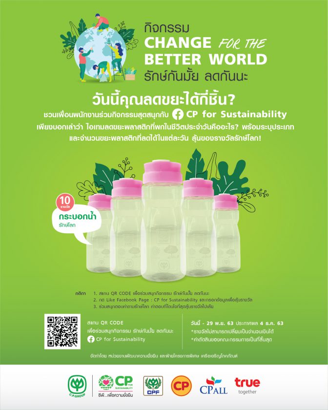 Facebook Page : CP for Sustainability ชวนเพื่อนพนักงานร่วมสนุกกับกิจกรรม CHANGE FOR THE BETTER WORLD รักษ์กันมั้ย ลดกันนะ แชร์ไอเทมลดขยะพลาสติกในสไตล์ตัวเอง ลุ้นของรางวัลรักษ์โลกสุดน่ารัก มาเล่นกันนะทุกคน!
