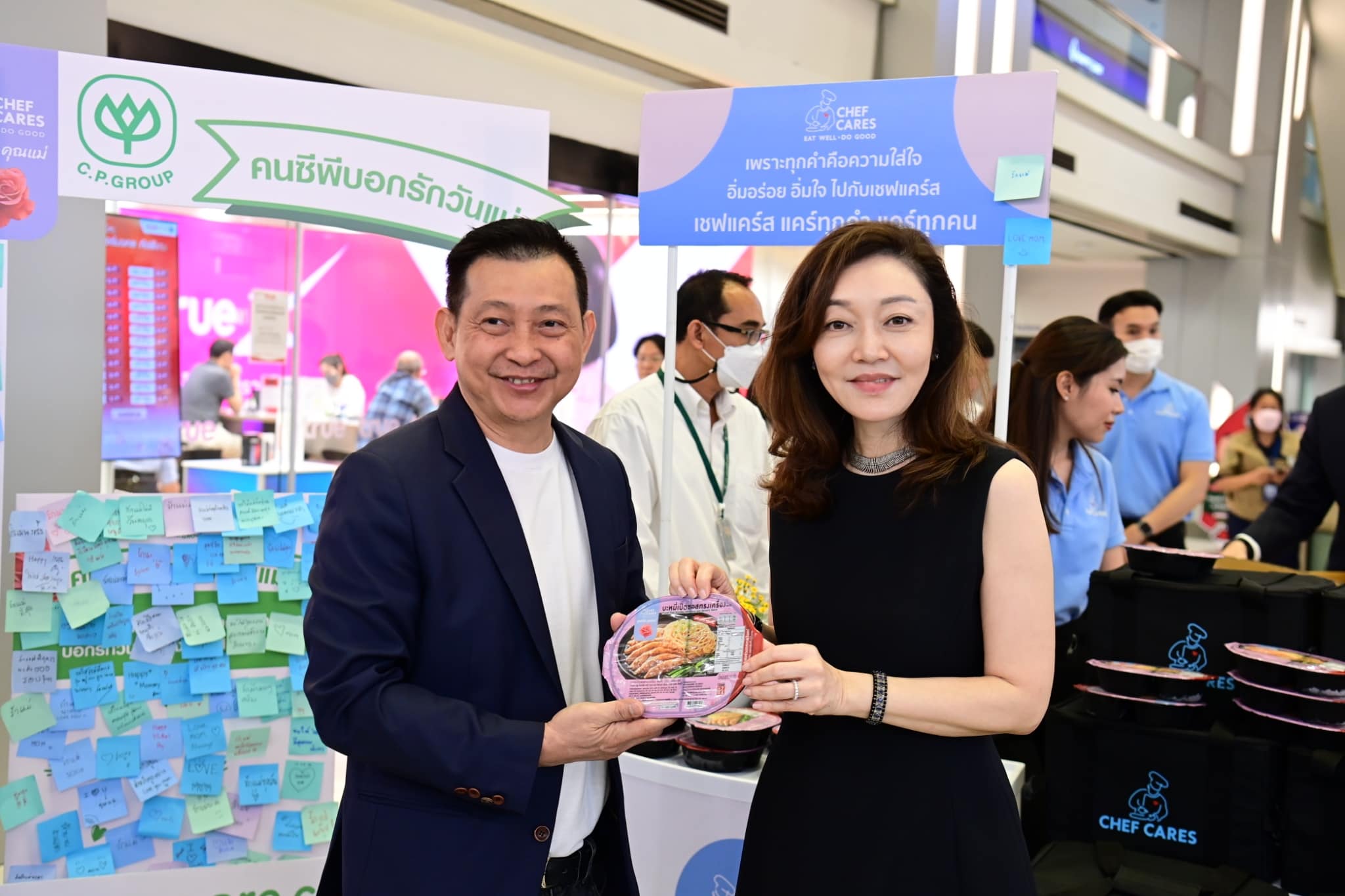 วันที่ 2 ของกิจกรรมคนซีพีบอกรักวันแม่ คุณสุภกิต เจียรวนนท์ ประธานกรรมการ เครือเจริญโภคภัรฑ์ พร้อมด้วย คุณมาริษา เจียรวนนท์ ผู้ก่อตั้งมูลนิธิเชฟแคร์ส ร่วมส่งมอบความรักและคิดถึง “คุณแม่” พร้อมนำ “บะหมี่เป็ดซอสทรงเครื่อง” สูตรคุณหญิงเทวี เจียรวนนท์ แบรนด์ Chef Cares แจกให้กับพนักงานและประชาชนย่านสีลม รวมถึงเปิดโอกาสให้ทุกคนได้บรรยายความรู้สึกต่างๆ ถึงคุณแม่ ในเทศกาลวันแม่ที่กำลังจะมาถึง ทำให้บรรยากาศบริเวณโถงชั้น 1 ซี.พี.ทาวเวอร์ อบอวลไปด้วยความอบอุ่น เต็มไปด้วยรอยยิ้ม สุขใจผู้ให้…อิ่มใจผู้รับ โดยมีคณะผู้บริหาร อาทิ คุณประสิทธิ์ บุญดวงประเสริฐ คุณพีรธน เกษมศรี ณ อยุธยา ดร.นริศ ธรรมเกื้อกูล และ คุณอภิชาติ สินธุมา ร่วมด้วย