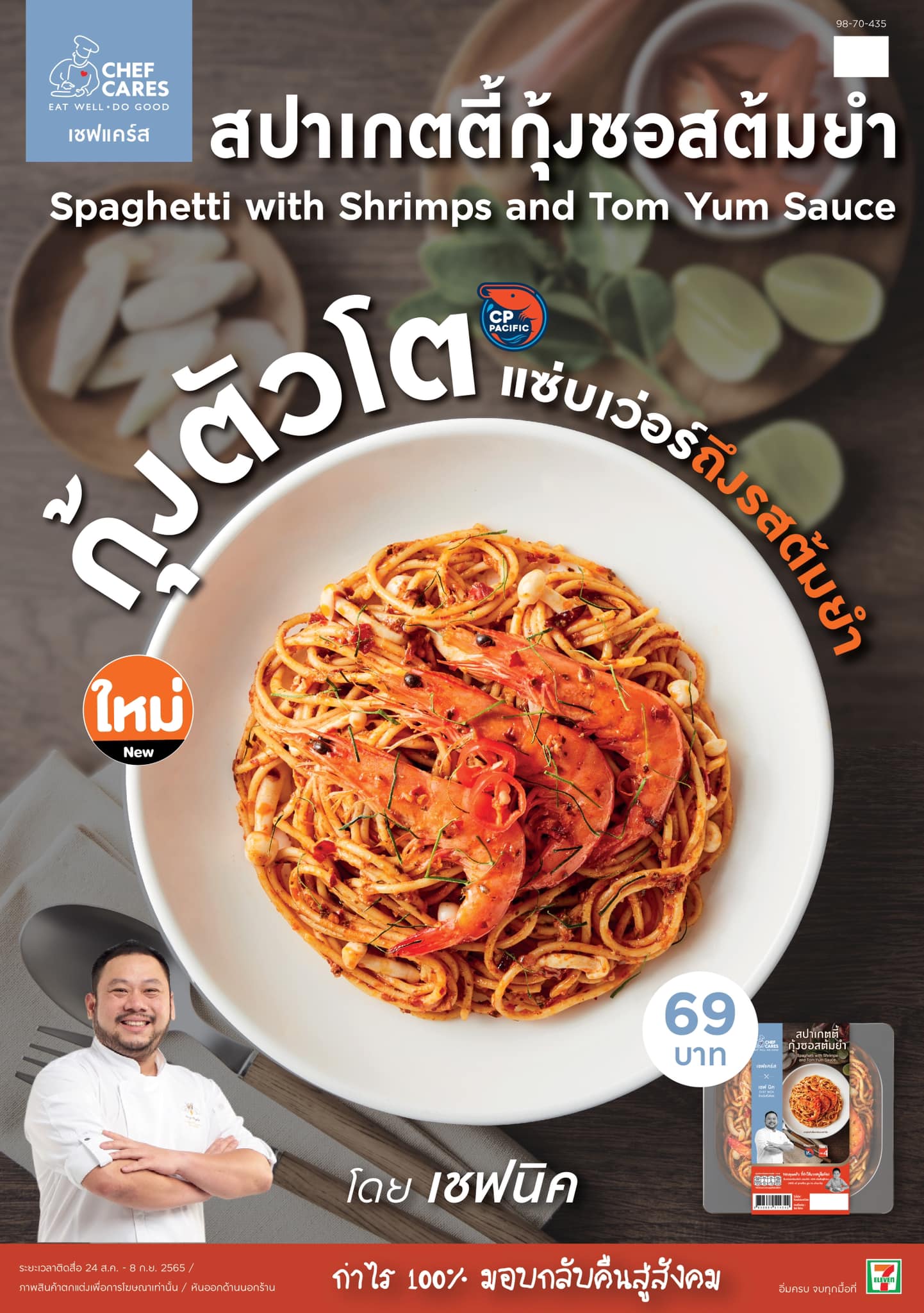 ทั้งนี้ เมนู “สปาเกตตี้กุ้งซอสต้มยำ” แบรนด์เชฟแคร์ส จำหน่ายในราคาเพียง 69 บาท ที่ 7-Eleven ทั่วไทย โดยกำไรทั้ง 100% คืนสู่สังคมผ่านมูลนิธิเชฟแคร์สเช่นเคย