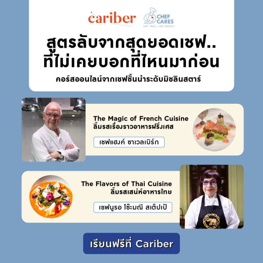 ครั้งแรก! มูลนิธิเชฟแคร์ส จับมือแพลตฟอร์มเรียนออนไลน์ Cariber ร่วมสร้างโอกาสทางอาชีพ ชวน 5 เชฟชั้นนำจากโครงการ Chef Cares ส่งมอบความรู้ฟรี หวังพัฒนาทักษะเชฟไทยสู่สากล