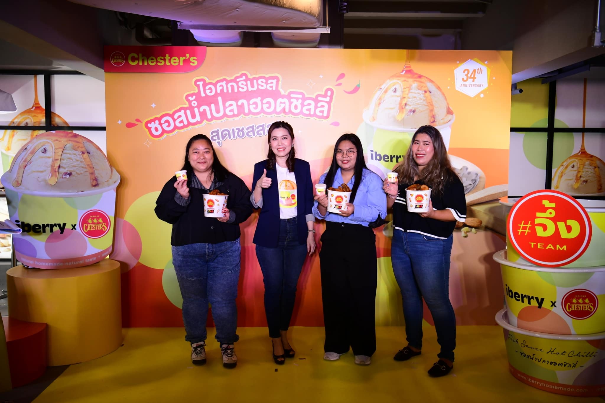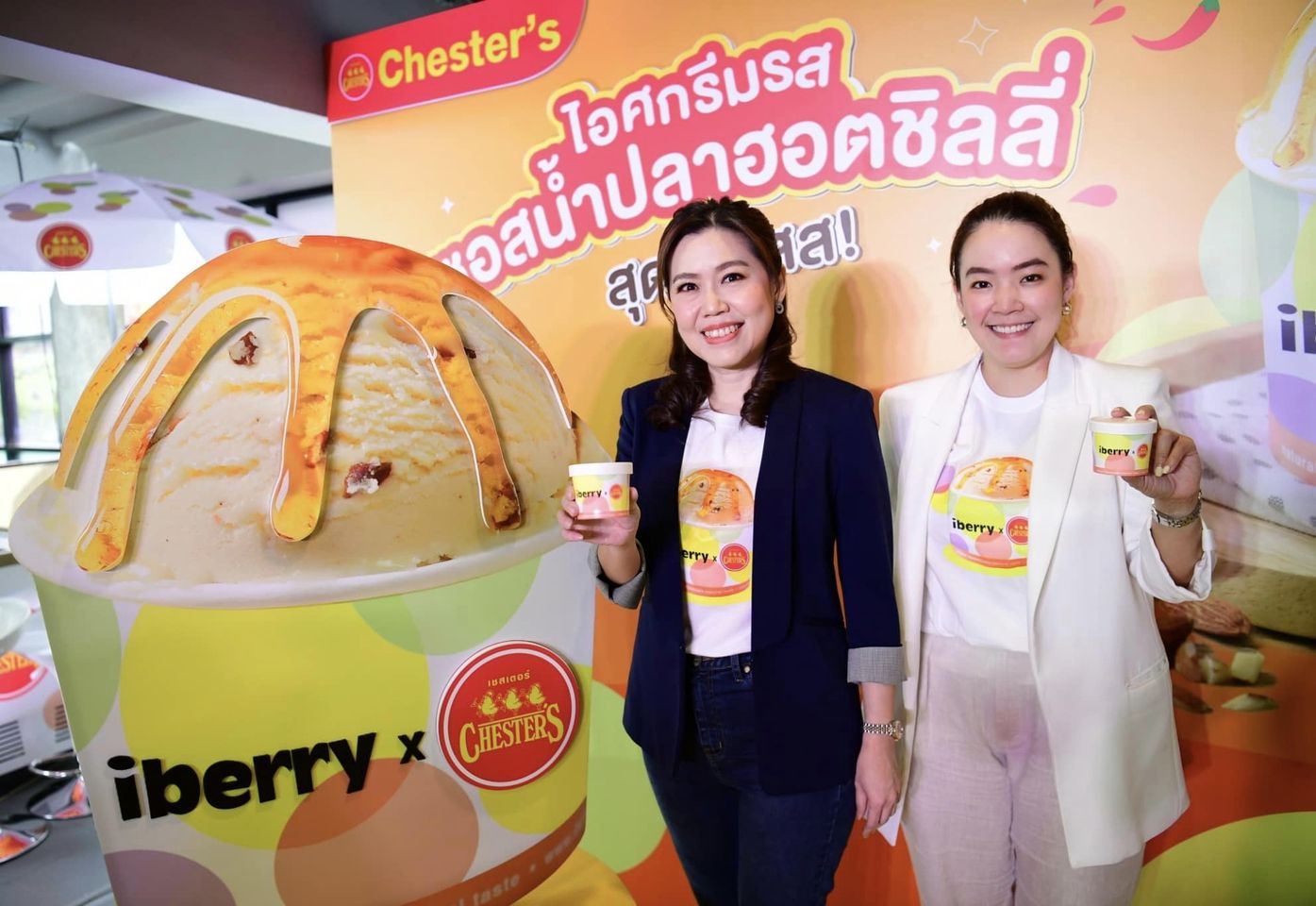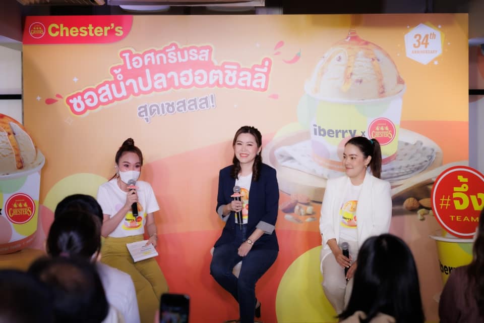 คุณลลนา บุญงามศรี กรรมการผู้จัดการ เชสเตอร์ ฟู้ด ธุรกิจร้านอาหารฟาสต์ฟู้ด ภายใต้แบรนด์ Chester’s ในเครือ CPF พร้อมด้วย คุณภาภัส สมิทธิกุล จาก iberry ร่วมฉลองครบรอบ 34 ปี เปิดตัวเมนูสุดเอ็กซ์คลูซีฟ “ไอศกรีมรสซอสน้ำปลาฮอตชิลลี่” ที่ได้แรงบันดาลใจจากเมนูซิกเนเจอร์ยอดนิยมอย่าง ไก่ย่างสูตรเผ็ดและข้าวไก่กรอบซอสน้ำปลา มารังสรรค์เป็นของหวาน แบบอร่อยจึ้ง สุดเชสสส! ร่วมกับแบรนด์ iberry ที่มีความเชี่ยวชาญด้านไอศกรีม มาร่วมพัฒนาสูตรด้วยวัตถุดิบคุณภาพดี อร่อยกลมกล่อมคงความเป็นเอกลักษณ์ของเชสเตอร์ด้วยซอสน้ำปลา แทรกความเผ็ดแซ่บเล็กๆ พร้อมเมล็ดอัลมอนด์เพิ่มความเพลิดเพลินเข้ากันอย่างลงตัว