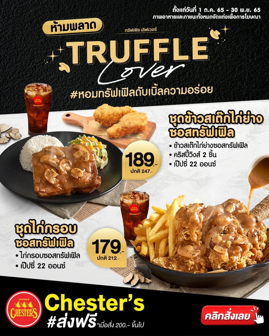 ไหนใครเป็น “ทรัฟเฟิลเลิฟเวอร์” “เชสเตอร์” ชวนสัมผัสรสชาติความอร่อยสุดพรีเมียม 28 ตุลาคม 2565SystemNews, ข่าวธุรกิจ, แนะนำผลิตภัณฑ์ในเครือ ชุดข้าวสเต๊กไก่ย่างซอสทรัฟเฟิล พิเศษ 189.- (ปกติ 247.-) ข้าวสเต๊กไก่ย่างซอสทรัฟเฟิล + คริสปี้วิงส์ 2 ชิ้น + เป๊ปซี่ 22 ออนซ์ ชุดไก่กรอบซอสทรัฟเฟิล พิเศษ 179.- (ปกติ 212.-) ไก่กรอบซอสทรัฟเฟิล + เป๊ปซี่ 22 ออนซ์ ตั้งแต่วันนี้ – 30 พ.ย. 65 เฉพาะสั่งเชสเตอร์เดลิเวอรี่ ผ่าน www.chesters.co.th หรือโทร 1145 เท่านั้น #สั่งเลยส่งฟรี (*เมื่อสั่ง 200.- ขึ้นไป) #Chesters #เชสเตอร์ #หอมทรัฟเฟิลดับเบิ้ลความอร่อย #Truffle #เชสเตอร์ผู้นำเมนูไก่ย่าง #โปรเด็ดโปรโดนที่เชสเตอร์เท่านั้น Post Views: 885