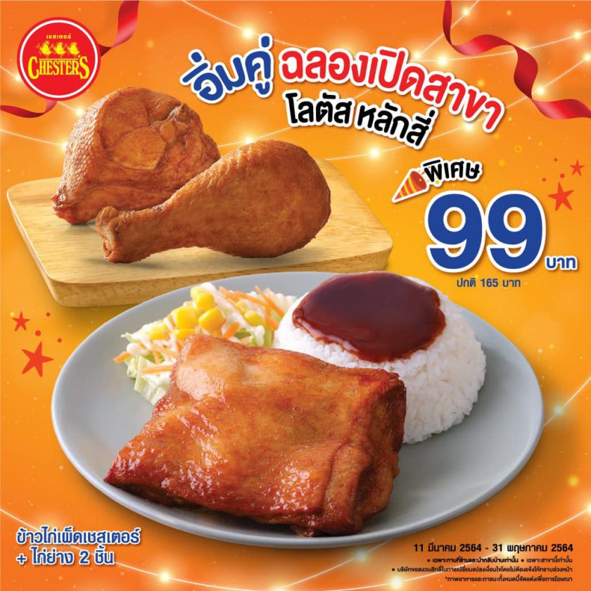 สำหรับ ร้านเชสเตอร์ สาขาโลตัสหลักสี่ ตั้งอยู่ชั้น 1 เปิดให้บริการทุกวัน ตั้งแต่ 10.00-20.00 น. จัดโปรโมชันให้อิ่มอร่อยไปกับเมนูอาหารคุณภาพยอดนิยม ด้วยราคาสุดคุ้ม อาทิ ซื้อข้าวไก่เผ็ดเชสเตอร์ ไก่ย่าง 2 ชิ้น ราคาพิเศษ 99 บาท (จากปกติ 165 บาท) ไก่ย่าง 5 ชิ้น และเชสเตอร์คูลเลอร์ (พร้อมเป๊ปซี่ 32 ออนซ์) ราคาพิเศษ 199 บาท และข้าวไก่เผ็ดเชสเตอร์ ข้าวอบไก่ย่าง และเชสเตอร์คูลเลอร์ (พร้อมเป๊ปซี่ 32 ออนซ์) ราคาพิเศษ 199 บาท ตั้งแต่วันนี้ – 31 พฤษภาคม 2564
