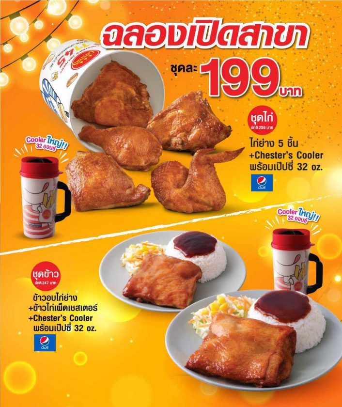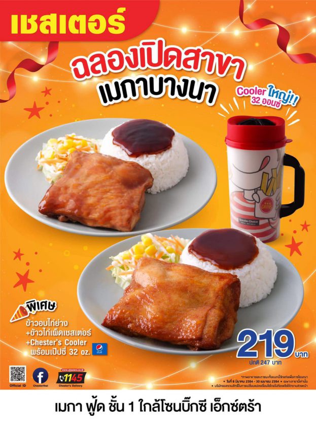 ส่วน สาขาเมกาบางนา ตั้งอยู่ชั้น 1 โซนเมกา ฟู้ดวอล์ค ใกล้ Big C Extra เปิดให้บริการทุกวัน ตั้งแต่ 10.00-21.00 น. มีโปรโมชันพิเศษไม่แพ้กัน คือ ข้าวไก่เผ็ดเชสเตอร์ ข้าวอบไก่ย่าง และเชสเตอร์คูลเลอร์ (พร้อมเป๊ปซี่ 32 ออนซ์) ราคาพิเศษ 219 บาท ตั้งแต่วันนี้ – 30 เมษายน 2564
