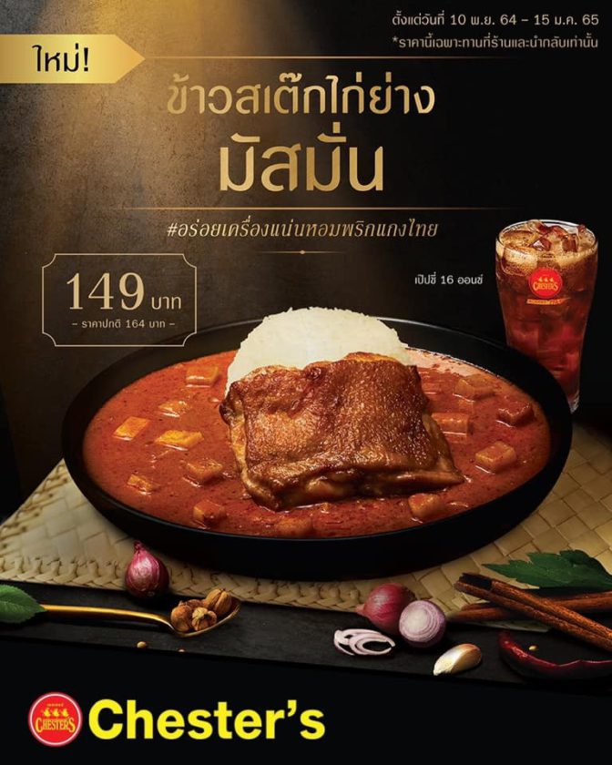 ‘เชสเตอร์’ ยกระดับเมนูที่คุ้นเคยสำหรับคนไทย จัดเต็มโปรโมชั่นสุดคุ้ม ด้วยชุดข้าวสเต๊กไก่ย่างมัสมั่น ประกอบด้วย ข้าวสเต๊กไก่ย่างมัสมั่น 1 จาน พร้อมเป๊ปซี่ 16 ออนซ์ 1 แก้ว ในราคาเพียง 149 บาทเท่านั้น (จากปกติ 164 บาท) ตั้งแต่วันนี้ – 15 ม.ค. 2565