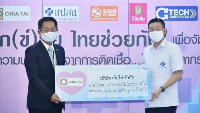 นายมนัส เจียรวนนท์ (ซ้าย) ประธานคณะผู้บริหาร บริษัท เจียไต๋ จำกัด ร่วมสนับสนุนโครงการ “ทุก(ข์)ภัย ไทยช่วยกัน”