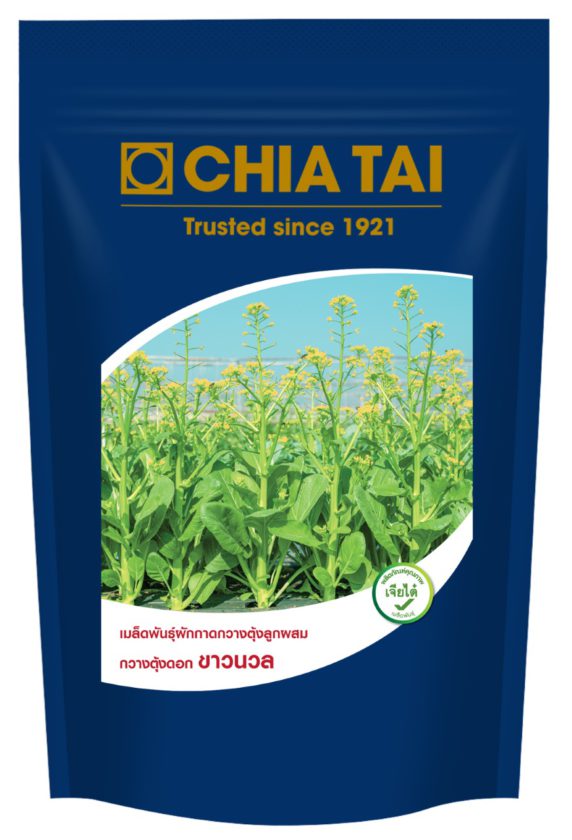 1.เมล็ดพันธุ์ผักกาดกวางตุ้งลูกผสม กวางตุ้งดอกต้นขาว ขาวนวล ต้นสีเขียวอ่อน ช่อดอกสวย ลำต้นอวบใหญ่ เจริญเติบโตดีสม่ำเสมอ จุดเด่น คือ มีน้ำหนักดี เฉลี่ยต่อต้นที่ 90-100 กรัม ซึ่งดีกว่าสายพันธุ์พื้นเมืองที่มีน้ำหนักต่อต้นเพียง 35-40 กรัม ทั้งยังให้ผลิตผลต่อไร่สูง เฉลี่ยที่ 5-3.5 ตันต่อไร่ ซึ่งสูงกว่าพันธุ์พื้นเมืองเท่าตัว และมีอายุเก็บเกี่ยว 30-35 วัน จึงทำให้เป็นที่นิยมสำหรับเกษตรกรผู้ปลูก