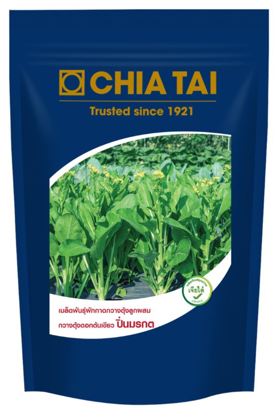 2.เมล็ดพันธุ์ผักกาดกวางตุ้งลูกผสม กวางตุ้งดอกต้นเขียว ปิ่นมรกต ต้นสีเขียวเข้ม มีช่อดอกและลำต้นอวบใหญ่ จุดเด่นที่เกษตรกรชื่นชอบ คือ มีน้ำหนักต่อต้นดีเฉลี่ยที่ 90-100 กรัม ซึ่งดีกว่าสายพันธุ์พื้นเมืองซึ่งน้ำหนักต่อต้นเพียง 35-40 กรัม และผลิตผลต่อไร่สูง โดยเฉลี่ย 5-3.5 ตันต่อไร่ สูงกว่าพันธุ์พื้นเมืองเท่าตัว อายุเก็บเกี่ยว 30-35 วัน