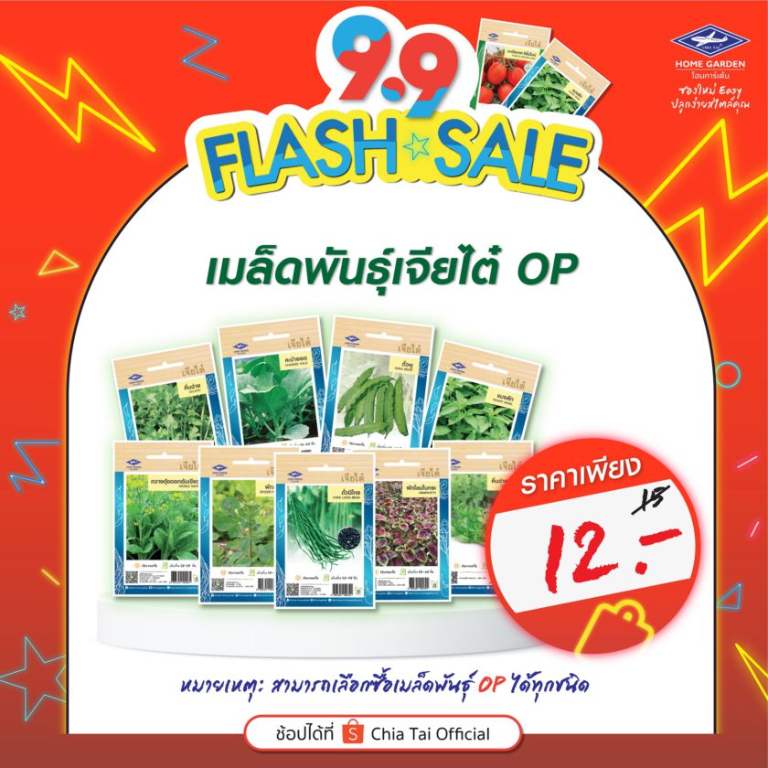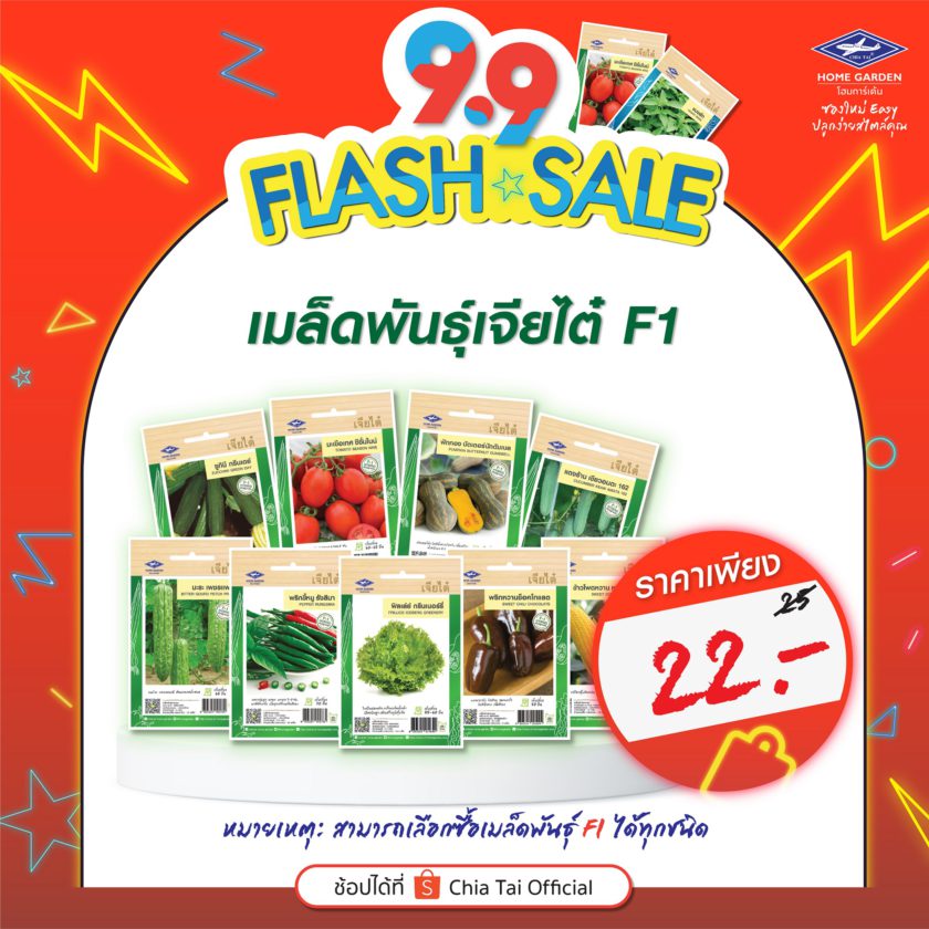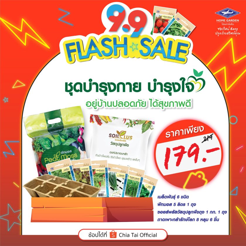 เจียไต๋ โฮมการ์เด้น โดยกลุ่มบริษัทเจียไต๋ ผู้นำธุรกิจนวัตกรรมการเกษตรของไทย ส่งโปรโมชั่นเอาใจสายปลูกให้ช้อปสนุกถูกใจกว่าเคย ด้วยดีลเด็ดๆ ที่พลาดไม่ได้กับ Flash Sale 9.9 จัดขบวนสินค้ามาให้เลือกซื้อในราคาพิเศษ ไม่ว่าจะเป็นเมล็ดพืชผักสวนครัวสายพันธุ์ทั่วไป (OP) ที่ผลิตผลล้วนเป็นวัตถุดิบในจานโปรดของแทบทุกบ้าน เช่น กะเพรา ผักบุ้งจีน คะน้าฮ่องกง มะเขือเทศสีดา เป็นต้น ในราคาเพียงซองละ 12 บาท (จากราคาปกติ 15 บาท) หรือเมล็ดพันธุ์สายพันธุ์ลูกผสม (F1 Hybrid) ที่หลายคนชื่นชอบในรสชาติผลสด อย่างแตงกวา มินิคิวค์ ลิซ่า เมล่อน โกลเด้นควีน แตงโม สมูทตี้ ไร้เมล็ด มินิบร็อคโคลี รอยัล เป็นต้น ในราคาซองละ 22 บาท (จากราคาปกติ 25 บาท) และพลาดไม่ได้กับชุดปลูก “บำรุงกาย บำรุงใจ” เพียงชุดเดียวได้ครบ ลงมือปลูกได้ทันที ประกอบด้วยเมล็ดพันธุ์ผักที่ช่วยบำรุงร่างกายต้านโรคภัยจำนวน 6 ซอง ได้แก่ มะระขี้นก กะเพราแดง พริกขี้หนูสวน หอมแบ่ง ผักบุ้งจีนเรียวไผ่ และผักชี พร้อมด้วยวัสดุปลูกพีทมอสเจียไต๋ขนาด 5 ลิตร 1 ถุง ถาดเพาะกล้ารักษ์โลก 8 หลุม 6 ชิ้น และวัสดุปลูกซอยล์พลัสอีก 1 กิโลกรัม ในราคาสุดพิเศษ 179 บาท (จากราคาปกติ 219 บาท) เตรียมช้อปกันได้แล้วกับโปรโมชั่นเด็ดๆ ที่เจียไต๋ โฮมการ์เด้น ขนทัพสินค้าจัดเต็ม 2 วันโดนๆ เฉพาะวันที่ 9 กันยายน 2564 และ 15 กันยายน 2564 เท่านั้น