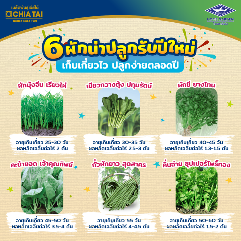 บริษัท เจียไต๋ จำกัด ผู้นำธุรกิจนวัตกรรมการเกษตรของไทย ขอแนะนำผักใบเขียว 6 ชนิด ที่ปลูกเองได้ไม่ยาก ปลูกได้ตลอดทั้งปี ทั้งยังใช้พื้นที่น้อย เพียงแค่มีพื้นที่ข้างบ้านริมรั้ว หรือแม้แต่ระเบียงของคอนโดหรืออะพาร์ตเมนต์ก็สามารถปลูกผักรับประทานเองได้แล้ว ซึ่งผักใบทั้ง 6 ชนิด ได้แก่ ผักบุ้งจีน เขียวกวางตุ้ง คะน้ายอด ถั่วฝักยาว ผักชี และคื่นฉ่าย ที่ล้วนอุดมด้วยสารคลอโรฟิลด์ ช่วยต้านอนุมูลอิสระ สร้างภูมิคุ้มกันให้ร่างกาย ต่อต้านการเกิดมะเร็ง ที่สำคัญคือปลูกง่ายและมีอายุเก็บเกี่ยวไว เพียง 1-2 เดือนก็สามารถเก็บนำมารับประทานได้แล้ว