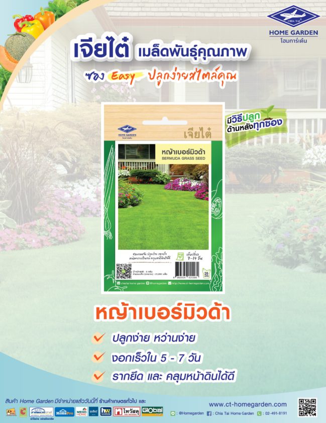 เจียไต๋ โฮมการ์เด้น โดยกลุ่มบริษัทเจียไต๋ ผู้นำธุรกิจนวัตกรรมการเกษตรของไทย ส่งสินค้าใหม่แกะกล่องที่จะช่วยให้การทำสวนของคุณพ่อบ้านคุณแม่บ้านง่ายและสะดวกสบายยิ่งขึ้น อาทิ เมล็ดพันธุ์หญ้าเบอร์มิวด้า ปลูกง่าย หญ้าขึ้นเร็วภายใน 5-7 วัน ช่วยคลุมหน้าดินได้ดี รากยึดแน่น ให้การปลูกหญ้าบนสวนสวยๆ เป็นเรื่องธรรมดาที่ใครๆ ก็ทำได้ และสำหรับผู้ที่รักสุขภาพ เจียไต๋ โฮมการ์เด้น ขอเสนอเมล็ดพันธุ์ต้นอ่อนข้าวสาลี ที่สามารถปลูกได้ทั้งในที่ร่มและกลางแจ้ง ปลูกง่าย โตไว สามารถนำต้นอ่อนข้าวสาลีไปคั้นเป็นเครื่องดื่มหรือทำน้ำสลัดที่ดีต่อสุขภาพ อุดมด้วยสารอาหารและวิตามิน