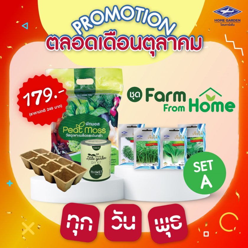 นอกจากนี้ ทุกวันพุธได้มีเฮกันตลอดทั้งเดือนตุลาคมนี้ เพราะเจียไต๋ โฮมการ์เด้น อยากชวนทุกคนมาสนุกกับการปลูกผักสวนครัวแบบง่ายๆ กันที่บ้าน ด้วยโปรโมชั่นชุดสนุกปลูก Farm From Home เซต A ลดราคาแบบจุกๆ เหลือ 179 บาท (จากปกติ 249 บาท) เอาใจมือใหม่ที่อยากเริ่มปลูกผัก ภายในชุดประกอบด้วยเมล็ดพันธุ์ผักบุ้งจีนเรียวไผ่ คะน้ายอด กวางตุ้งฮ่องเต้ เมล็ดพันธุ์ไควาเระ ชุดสนุกปลูกกะเพรา ถาดเพาะรักษ์โลก และวัสดุปลูกพีทมอส และพิเศษ เมื่อซื้อครบ 200 บาทขึ้นไป รับฟรี เมล็ดพันธุ์ซองจัมโบ้ จำนวน 1 ซอง (มูลค่า 40 บาท) ทุกการสั่งซื้อผ่านทาง Shopee ร้าน Chia Tai Official เท่านั้น อย่าพลาด กดสินค้าที่อยากได้เก็บลงตะกร้าไว้ก่อน แล้วมาซื้อกันได้ในวันพุธตลอดเดือนตุลาคมนี้