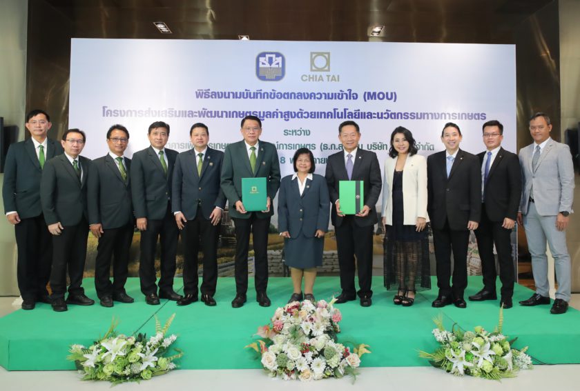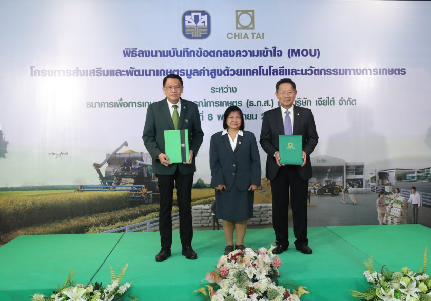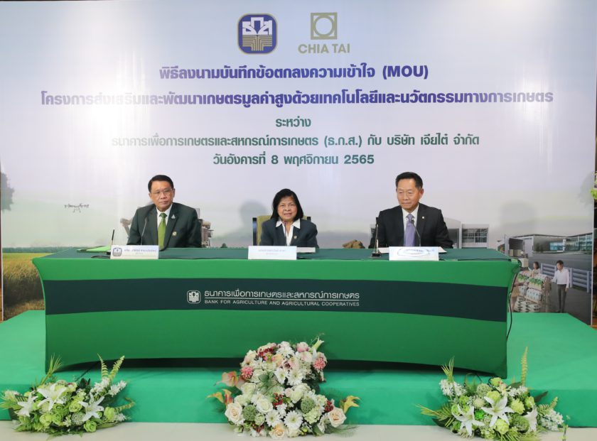วันที่ 8 พฤศจิกายน 2565 นายธนารัตน์ งามวลัยรัตน์ ผู้จัดการธนาคารเพื่อการเกษตรและสหกรณ์การเกษตร (ธ.ก.ส.) และนายมนัส เจียรวนนท์ ประธานคณะผู้บริหาร บริษัท เจียไต๋ จำกัด ร่วมลงนามบันทึกข้อตกลง “โครงการส่งเสริมและพัฒนาเกษตรมูลค่าสูง” เพื่อสนับสนุนการนำเทคโนโลยีและนวัตกรรมมาปรับใช้ในภาคเกษตรกรรม การเติมองค์ความรู้ในการวางแผนการผลิตที่สามารถสร้างกำไร พร้อมสนับสนุนสินเชื่ออัตราดอกเบี้ยต่ำให้เกษตรกรและผู้ประกอบการเกษตร เพื่อเพิ่มมูลค่าผลผลิตและเสริมศักยภาพการแข่งขันเกษตรไทยไปสู่ตลาดโลก ณ ห้องโถง ชั้น 2 อาคารทาวเวอร์ ธนาคารเพื่อการเกษตรและสหกรณ์การเกษตร สำนักงานใหญ่ กรุงเทพฯ