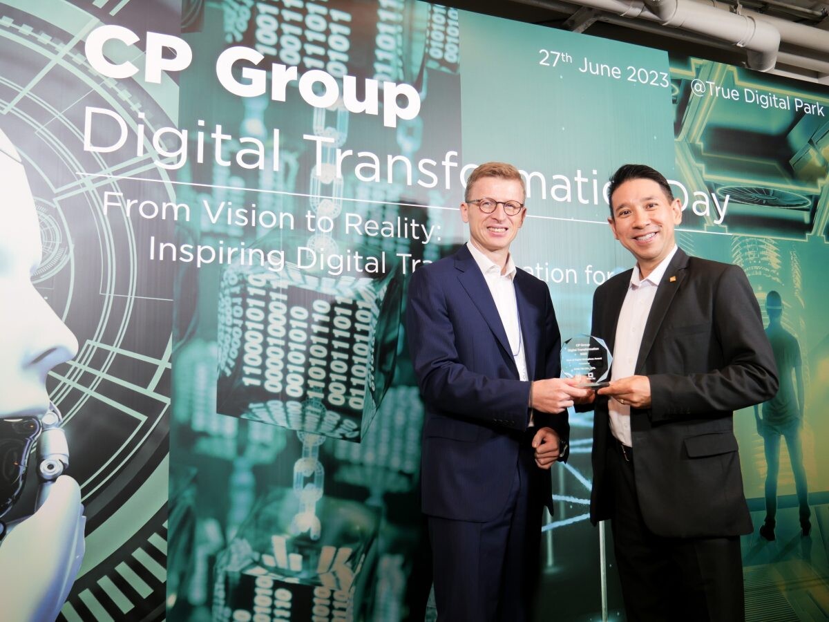 คุณประวินทร์ คุโรวาท ประธานบริหารด้านการเงินและบริหารกลาง บริษัท เจียไต๋ จำกัด ผู้นำธุรกิจนวัตกรรมการเกษตรของไทย รับมอบรางวัล CP Group Digital Transformation 2022 สาขา Best of Digital Workplace จาก ดร.ไมเคิล กรีซีลส์ Group Chief Digital Officer เครือเจริญโภคภัณฑ์ ในงาน CP Group Digital Transformation Day ณ อาคารเพกาซัส ทรู ดิจิทัล พาร์ค