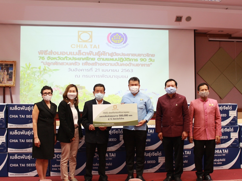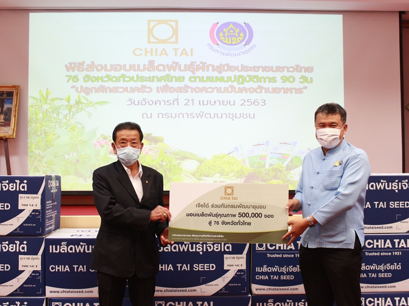 กรุงเทพฯ 22 เมษายน 2563 – บริษัท เจียไต๋ จำกัด ผู้นำธุรกิจเกษตรครบวงจรของไทย ร่วมสนับสนุนกรมการพัฒนาชุมชน กระทรวงมหาดไทย ในการดำเนินแผนปฏิบัติการ 90 วัน “ปลูกผักสวนครัว เพื่อสร้างความมั่นคงทางอาหาร” พร้อมมอบเมล็ดพันธุ์ผักสวนครัวจำนวน 500,000 ซอง เพื่อนำไปแจกจ่ายให้ประชาชนใน 76 จังหวัดทั่วประเทศได้มีเมล็ดพันธุ์คุณภาพดีสำหรับปลูกรับประทานภายในครัวเรือน สร้างความมั่นคงและปลอดภัยทางด้านอาหาร และบรรเทาผลกระทบจากวิกฤตโควิด-19