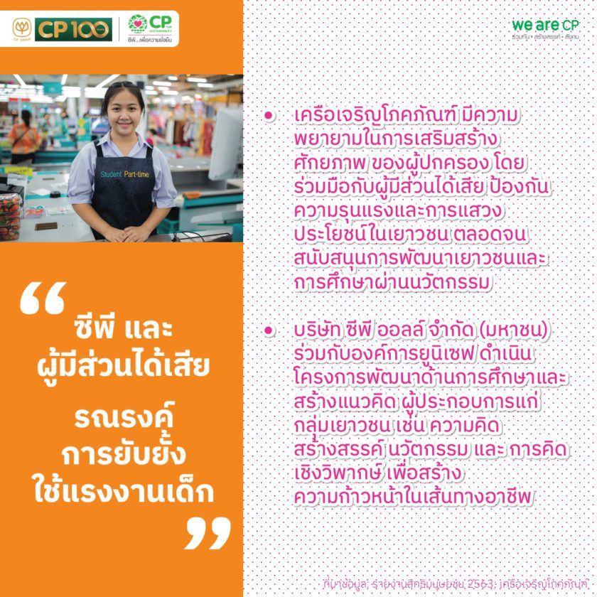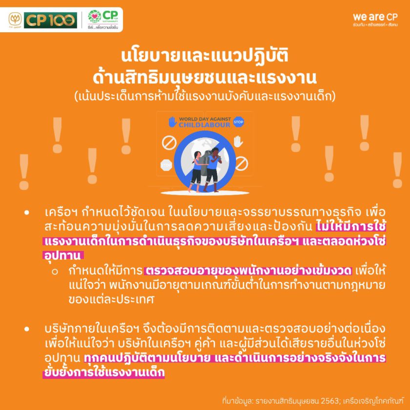 บริษัทภายในเครือฯ จึงต้องมีการติดตามและตรวจสอบอย่างต่อเนื่อง เพื่อให้แน่ใจว่า บริษัทในเครือฯ คู่ค้า และผู้มีส่วนได้เสียรายอื่นในห่วงโซ่อุปทานปฏิบัติตามนโยบาย และดำเนินการอย่างจริงจังในการ ‘ยับยั้งการใช้แรงงานเด็ก’