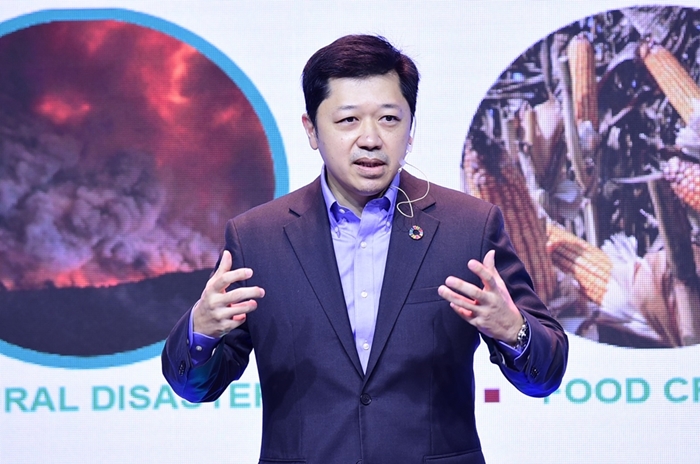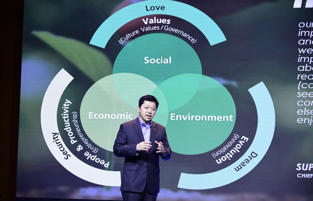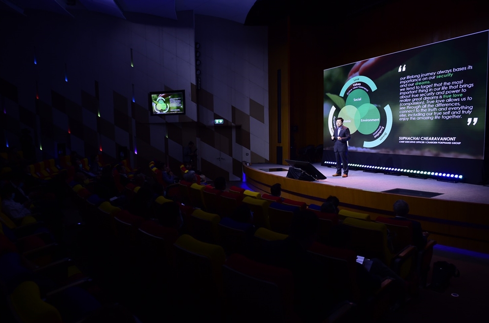 โดยปาฐกถาพิเศษของซีอีโอเครือซีพีได้สร้างแรงบันดาลใจ และปลุกพลังให้ผู้นำภาคธุรกิจร่วมสร้างการเปลี่ยนแปลง โดยระบุว่าการที่ภาคธุรกิจเอกชนจะสร้างจุดเริ่มต้นที่ให้ความสำคัญกับการทำธุรกิจที่ควบคู่ไปกับการสร้างความยั่งยืนได้นั้นต้องเริ่มจากการสร้างการตระหนักรู้ก่อน มองให้เห็นว่าอนาคตของโลกใบนี้และวิถีบริโภค วิธีใช้ทรัพยากรธรรมชาติของเราที่แท้จริงแล้วยังไม่ยั่งยืน ทำให้เกิดภาวะเรือนกระจกจากคาร์บอนไดออกไซด์ และภาวะโลกร้อนขึ้น ส่งผลให้สายพันธุ์สัตว์จำนวนมากกำลังหายไป ตลอดจนสายพันธุ์ของมนุษย์ด้วยกันเองก็จะหายไปได้