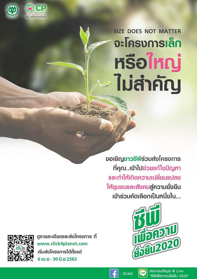นี่เป็นโอกาสครั้งสำคัญที่ชาวซีพี จะได้มาร่วมเป็นส่วนหนึ่งในการสร้างเมล็ดพันธุ์แห่งความดีให้เกิดขึ้นในสังคมผ่านโครงการ “ซีพีเพื่อความยั่งยืน 2020” ไม่ว่าจะโครงการจะเล็กหรือใหญ่ก็สามารถส่งผลงานเข้าร่วมคัดเลือกกันได้