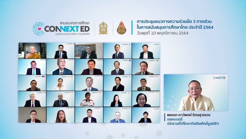 11 พ.ย. 64 – สร้างวัฒนธรรมการมีส่วนร่วมด้านการศึกษาอย่างต่อเนื่อง…มูลนิธิสานอนาคตการศึกษา คอนเน็กซ์อีดี (CONNEXT ED) นำโดย องคมนตรี พลเอก ดาว์พงษ์ รัตนสุวรรณ (กลาง – แถวบน) ในฐานะประธานที่ปรึกษากิตติมศักดิ์ จัดการประชุม “แนวทางความร่วมมือ 3 ภาคส่วนในการสนับสนุนการศึกษาไทย ประจำปี 2564” ในรูปแบบออนไลน์ โดยมีคณะที่ปรึกษาและผู้ทรงคุณวุฒิจากภาครัฐ ภาคประชาสังคม และภาคเอกชน นำโดยนายศุภชัย เจียรวนนท์ (ที่ 3 จากขวา – แถวที่ 3 จากบน) ประธานคณะผู้บริหาร เครือเจริญโภคภัณฑ์ ในฐานะประธานกรรมการมูลนิธิฯ พร้อมด้วยซีอีโอ คณะผู้บริหารจากองค์กรผู้ร่วมก่อตั้ง ตลอดจนเครือข่ายพันธมิตร ร่วมกันหารือ แลกเปลี่ยนความคิดเห็น และวางแผนการดำเนินงานของมูลนิธิฯ เพื่อเดินหน้าสานต่อเจตนารมย์และความมุ่งมั่นในการขับเคลื่อนการศึกษาไทยให้พัฒนาก้าวไกลอย่างมั่นคงและยั่งยืน ซึ่งในโอกาสนี้ มูลนิธิสานอนาคตการศึกษา คอนเน็กซ์อีดี ยังได้ต้อนรับ 13 พันธมิตรใหม่ รุ่นที่ 3 อย่างเป็นทางการ อันนำไปสู่การขยายความร่วมมือจาก 12 องค์กรเอกชนชั้นนำผู้ร่วมก่อตั้ง และ 19 องค์กร รุ่นที่ 2 รวมปัจจุบัน มีเครือข่ายพันธมิตรจากภาคเอกชนทั้งสิ้น 44 องค์กร