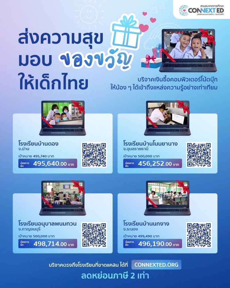 เพียงสนับสนุนบริจาคเงินซื้อคอมพิวเตอร์โน้ตบุ๊กให้โรงเรียนคอนเน็กซ์อีดีที่ขาดแคลนทั่วประเทศ