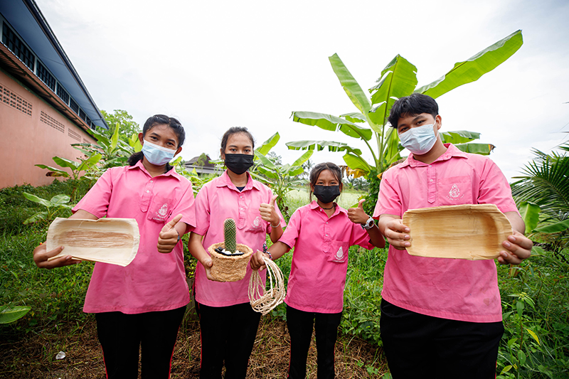 เมื่อมีกล้วยเป็นผลิตภัณฑ์ท้องถิ่นเป็นทุนเดิมอยู่แล้ว โรงเรียนวัดชมพูประดิษฐ์ อ.ปากพนัง จ.นครศรีธรรมราช จึงได้นำการแปรรูปปาล์มกล้วย มาบูรณาการเข้ากับกลุ่มสาระการเรียนรู้ทั้ง 8 กลุ่ม ผนวกกับภูมิปัญญากับชาวบ้านและคนในชุมชน นำวัตถุดิบจากธรรมชาติมาพัฒนาเป็นผลิตภัณฑ์ต่าง ๆ ไม่ว่าจะเป็น เชือกกล้วยหูหิ้วถ้วยกาแฟ ถาดใส่อาหารทำจากใบตอง กระถางต้นไม้จากใยกล้วยที่สามารถเพาะลงกระถางและย่อยสลายไปพร้อมกับดิน เป็นต้น สร้างมูลค่าเพิ่ม ต่อยอดเป็นอาชีพ สร้างรายได้กลับคืนสู่ชุมชน และยังเพิ่มสกิลการบริหารจัดการคำนวณต้นทุนผลผลิต การคิดราคาจำหน่าย การใช้สื่อออนไลน์ในการขายสินค้า และยังเป็น “ศูนย์การเรียนรู้” ให้ชาวบ้านในชุมชนเข้ามาศึกษาในรูปแบบการเรียนรู้ตลอดชีวิต (Life long Learning) อีกด้วย