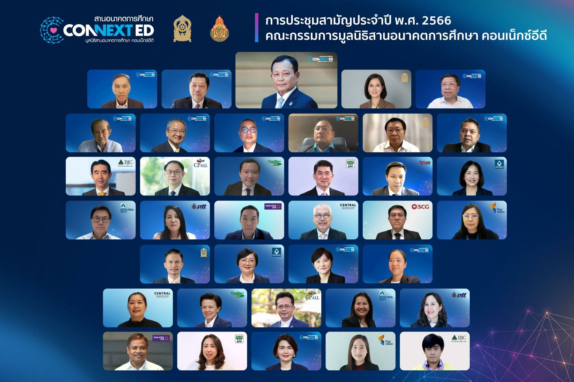 เดินหน้าผนึกกำลังเพื่อการศึกษาไทยที่มั่นคงและยั่งยืน…มูลนิธิสานอนาคตการศึกษา คอนเน็กซ์อีดี จัดการประชุมสามัญ ประจำปี 2566 คณะกรรมการมูลนิธิฯ เป็นปีที่ 4 ในรูปแบบออนไลน์ นำโดย องคมนตรี พลเอก ดาว์พงษ์ รัตนสุวรรณ (กลาง – แถวบน) ในฐานะประธานที่ปรึกษากิตติมศักดิ์ พร้อมด้วยคณะที่ปรึกษาและผู้ทรงคุณวุฒิจากภาครัฐ โดยนางสาวตรีนุช เทียนทอง (ที่ 2 จากขวา – แถวบน) รักษาการรัฐมนตรีว่าการกระทรวงศึกษาธิการ ภาคประชาสังคม และนายศุภชัย เจียรวนนท์ (ที่ 2 จากซ้าย – แถวบน) ประธานกรรมการมูลนิธิฯ และประธานคณะผู้บริหาร เครือเจริญโภคภัณฑ์ ตลอดจนซีอีโอ คณะผู้บริหารจาก 12 องค์กรผู้ร่วมก่อตั้ง และคณะทำงานมูลนิธิฯ เพื่อสานต่อภารกิจ ร่วมหารือและวางแผนงาน เดินหน้าความร่วมมือที่เข้มแข็งจากทุกภาคส่วน ในการร่วมยกระดับการจัดการการศึกษาในโรงเรียนคอนเน็กซ์อีดีที่อยู่ในสังกัดสพฐ. จำนวน 5,570 แห่ง ทั่วประเทศ โดยมีผลการดำเนินงานสำคัญและความคืบหน้าตาม 5 ยุทธศาสตร์หลัก ได้แก่