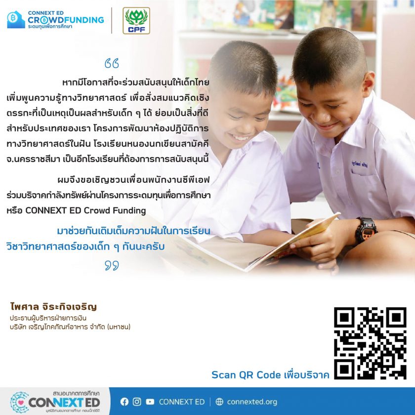 คุณไพศาล จิระกิจเจริญ ประธานคณะผู้บริหารฝ่ายการเงิน CPF ชวนชาว CP-CPF “เติมเต็มความฝันการเรียนวิชาวิทยาศาสตร์ให้น้องๆ” ยกระดับการเรียนรู้ของเด็กไทย ผ่านมูลนิธิสานอนาคตการศึกษา CONNEXT ED ไปด้วยกัน