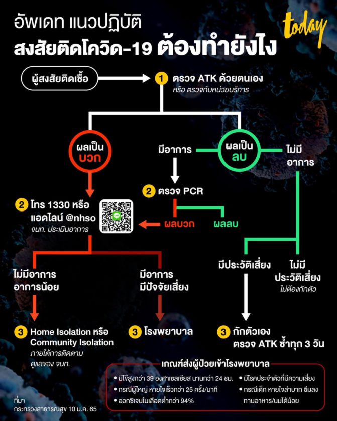 กรณีตรวจด้วยตนเอง หากผล ATK เป็น ‘บวก’ ให้ติดต่อ สปสช. โทร 1330 ได้ตลอด 24 ชม. หรือแอดไลน์ @nhso จะมีเจ้าหน้าที่คอยช่วยเหลือ ประเมินอาการให้ว่าอยู่ในระดับใด