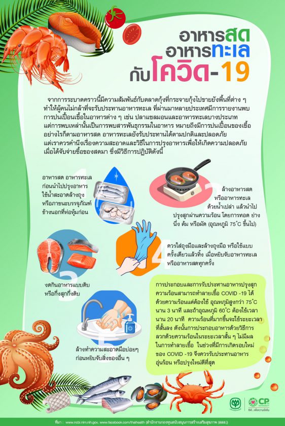 2. ล้างอาหารสดหรืออาหารทะเล ด้วยน้ำเปล่า แล้วนำไปปรุงสุกผ่านความร้อน โดยการทอด ย่าง นึ่ง ต้ม หรือผัด (อุณหภูมิ 75องศาเซลเซียสขึ้นไป)