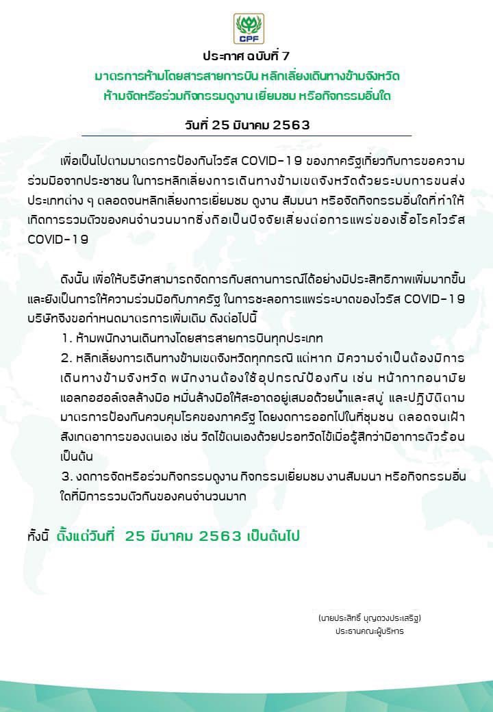 คุณประสิทธิ์ บุญดวงประเสริฐ CEO ซีพีเอฟ ออกประกาศ ฉบับที่ 7 เรื่องมาตรการห้ามโดยสารสายการบิน หลีกเลี่ยงการเดินทางข้ามจังหวัด ห้ามจัดหรือร่วมกิจกรรมดูงาน เยี่ยมชม หรือกิจกรรมอื่นใดที่เกิดการรวมตัวของคนจำนวนมาก ซึ่งถืออาจเป็นปัจจัยเสี่ยงต่อการแพร่ของเชื้อโรคไวรัสโคโรนา 2019 (COVID-19)