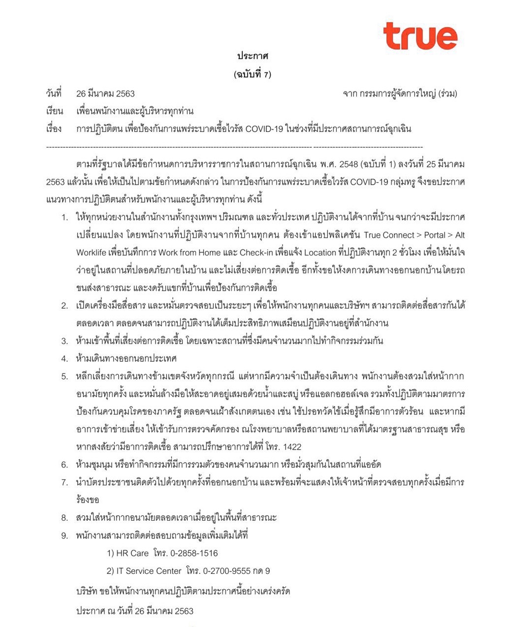 ส่วนทางทรู โดย กรรมการผู้จัดการใหญ่(ร่วม) ได้ออกประกาศฉบับที่ 7 รองรับการประกาศสถานการณ์ฉุกเฉินเช่นเดียวกัน