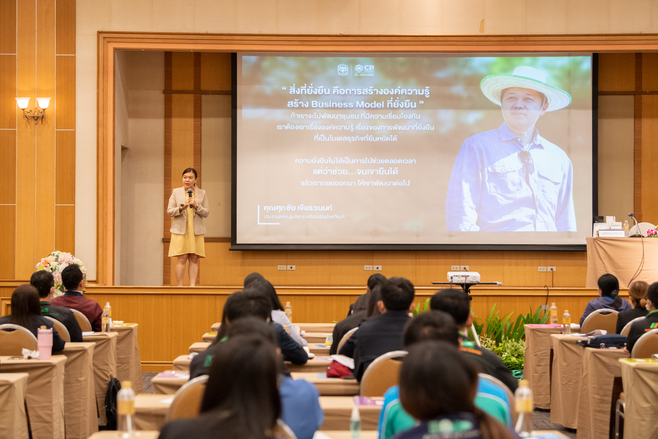 1-2 ธ.ค. 2565 คุณพิไลลักษณ์ พิชัยวัตต์ ผู้ช่วยกรรมการผู้จัดการด้านปฏิบัติการความยั่งยืนและกิจการเพื่อสังคม เครือเจริญโภคภัณฑ์ และทีมสำนักงานด้านความยั่งยืนและพัฒนาชุมชน จ.น่าน เครือเจริญโภคภัณฑ์ ร่วมเป็นวิทยากรถ่ายทอดความรู้จากการถอดบทเรียน มิติงานบริหารและพัฒนาวิสาหกิจชุมชนจากพื้นที่ปฏิบัติการต้นน้ำปิง วัง ยม และน่าน ให้แก่เจ้าหน้าที่ผู้รับผิดชอบงานส่งเสริมการจัดตั้งและบริหารจัดการวิสาหกิจเกษตรฐานชีวภาพและภูมิปัญญาท้องถิ่นจำนวน 110 คน จาก 77 จังหวัด ณ โรงแรมเอเชีย แอร์พอร์ท