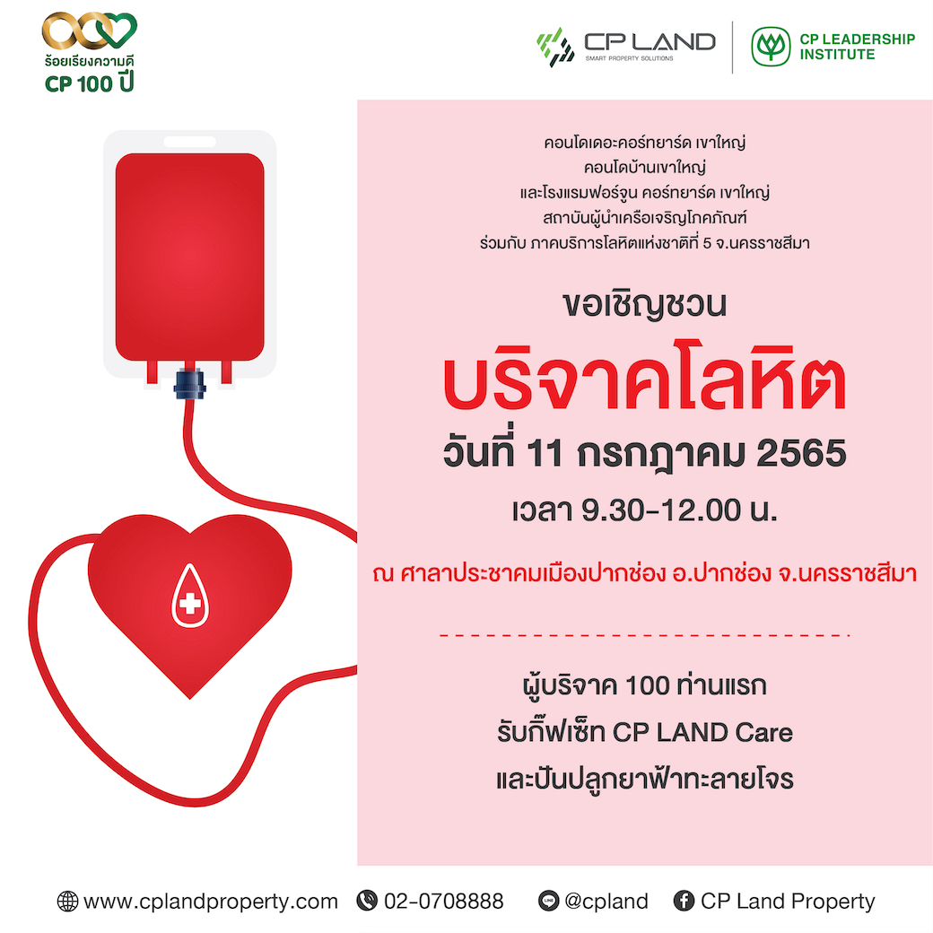 คอนโดเดอะคอร์ทยาร์ด เขาใหญ่ คอนโดบ้านเขาใหญ่ และโรงแรมฟอร์จูน คอร์ทยาร์ด เขาใหญ่ สถาบันผู้นำเครือเจริญโภคภัณฑ์ และ ภาคบริการโลหิตแห่งชาติที่ 5 จ.นครราชสีมา ขอเชิญชวนร่วมบริจาคโลหิต วันที่ 11 กรกฎาคม 2565 เวลา 9.30-12.00 น. ณ ศาลาประชาคมเมืองปากช่อง อ.ปากช่อง จ.นครราชสีมา