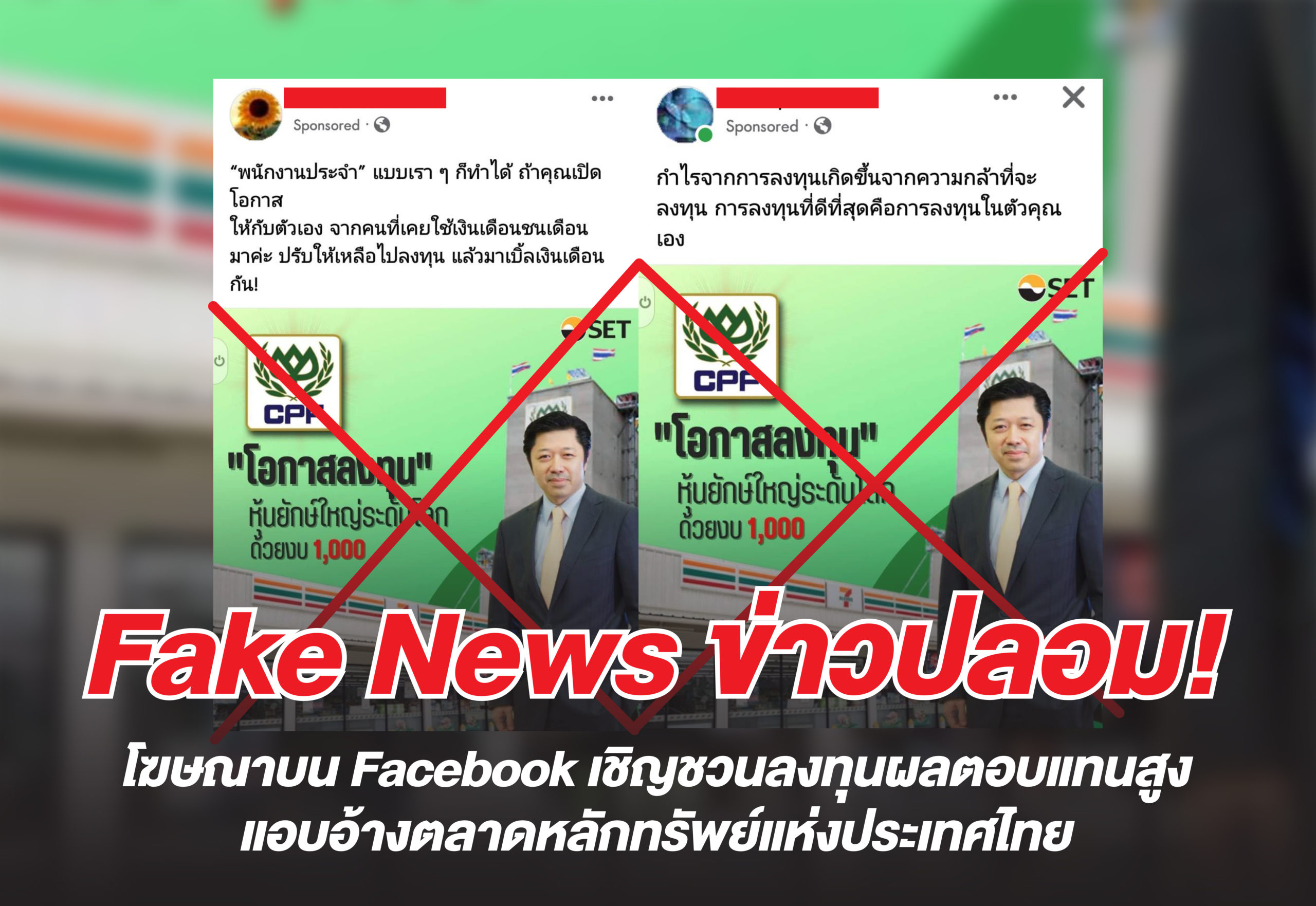 เครือเจริญโภคภัณฑ์ เตือนประชาชนอย่าหลงเชื่อมิจฉาชีพ ที่เผยแพร่ข้อความหลอกลวงบนเฟซบุ๊ก โดยใช้ชื่อ โลโก้ ภาพ และรูปภาพผู้บริหาร ของเครือเจริญโภคภัณฑ์ รวมทั้งแอบอ้างนำโลโก้ของตลาดหลักทรัพย์แห่งประเทศไทย (SET) มาใช้เพื่อให้เกิดความน่าเชื่อถือ ซึ่งเป็นการโฆษณาหลอกลวงประชาชนด้วยการเชิญชวนให้ลงทุน โดยมีผลตอบแทนสูงมาจูงใจให้หลงเชื่อ