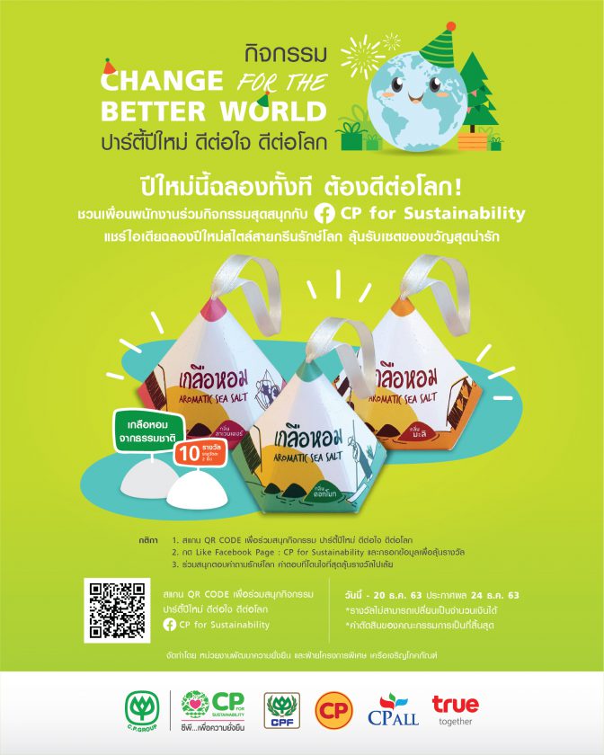 Facebook Page : CP for Sustainability ชวนเพื่อนพนักงานร่วมสนุกกับกิจกรรม CHANGE FOR THE BETTER WORLD ปาร์ตี้ปีใหม่ ดีต่อใจ ดีต่อโลก แชร์ไอเดียฉลองปีใหม่สไตล์ สายกรีนรักษ์โลก ลุ้นรับของขวัญสุดน่ารัก เกลือหอมจากธรรมชาติ สำหรับดับกลิ่นในบ้าน รถ ตู้เสื้อผ้า ช่วยให้กลิ่นหอมสบาย ชวนผ่อนคลาย จำนวน 10 รางวัล รางวัลละ 2 ชิ้น (คละกลิ่น)