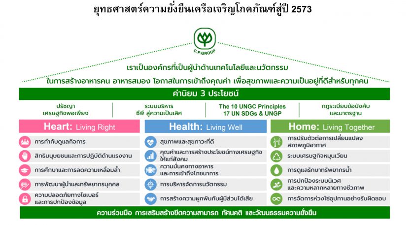 เครือเจริญโภคภัณฑ์ ประกาศยุทธศาสตร์และเป้าหมายการพัฒนาอย่างยั่งยืนสู่ปี 2573 ยืนยันความมุ่งมั่นในการทำให้ธรรมาภิบาลและการพัฒนาอย่างยั่งยืนเป็นหนึ่งเดียวกับธุรกิจ ก้าวสู่อนาคตที่ยั่งยืนทั้งด้านเศรษฐกิจ สังคม และสิ่งแวดล้อม เพื่อโลก เพื่อคนรุ่นปัจจุบันและอนาคต พร้อมทั้งต่อยอดความสำเร็จจากเป้าหมายความยั่งยืนในปี 2563 และการมีส่วนร่วมเป้าหมายการพัฒนาที่ยั่งยืน หรือ Sustainable Development Goals (SDGs) ขององค์การสหประชาชาติทั้ง 17 เป้าหมายภายในปี 2573