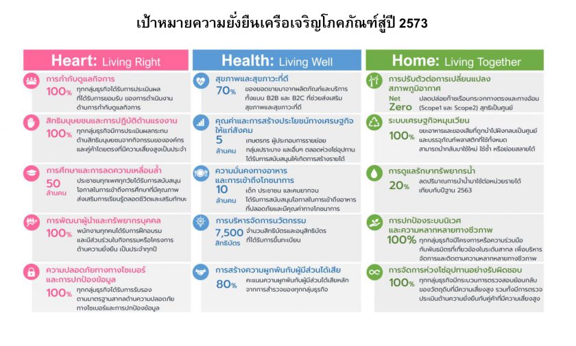 ทั้งนี้ ได้กำหนดเป้าหมายการพัฒนาที่ยั่งยืนเพื่อเป็นแนวปฏิบัติครอบคลุมบริษัทในเครือเจริญโภคภัณฑ์ทั้งในประเทศและต่างประเทศ ภายใต้ยุทธศาสตร์ 3 ด้านหลัก คือ Heart: Living Right, Health: Living Well และ Home: Living Together เริ่มตั้งแต่เดือนมกราคม ปี 2564 ถึงเดือนธันวาคม 2573 ครอบคลุมระยะเวลา 10 ปี โดยมีประเด็นสำคัญด้านความยั่งยืน 15 ประเด็นดังนี้