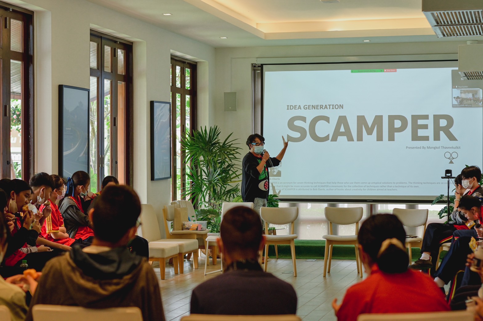 โดยเชิญวิทยากรที่มีความเชี่ยวชาญ 3 ท่าน จากบริษัท ทรู คอร์ปอเรชั่น จำกัด (มหาชน) มาให้ความรู้กับน้องๆ ได้แก่ คุณลัดดา พลอยมีค่า Department , Strategy & Sustainable Development คุณสุชิน แสงละออ Department , Strategy & Sustainable Development และคุณมงคล ทวีกุลกิจ Department , Innovation Center ได้มาบรรยายหลักสูตร “แนวคิดนวัตกรรมและการจัดการขยะ” โดยใช้หลักแนวคิด SCAMPER นอกจากนี้ยังมีการให้แนวทางกับน้อง ๆ นักเรียนในการสร้างสรรค์นวัตกรรมสิ่งประดิษฐ์เพื่อแก้ไขปัญหาการจัดการขยะอย่างยั่งยืน