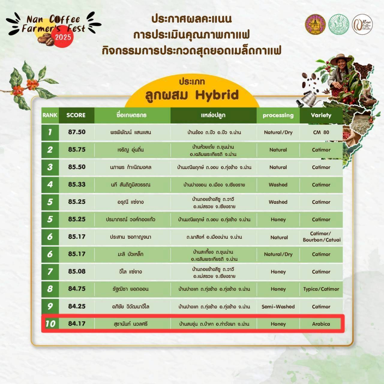 TOP 10 คะแนน 84.17 การประกวดสุดยอดเมล็ดกาแฟ งาน NAN Farmer’s Fest 2025